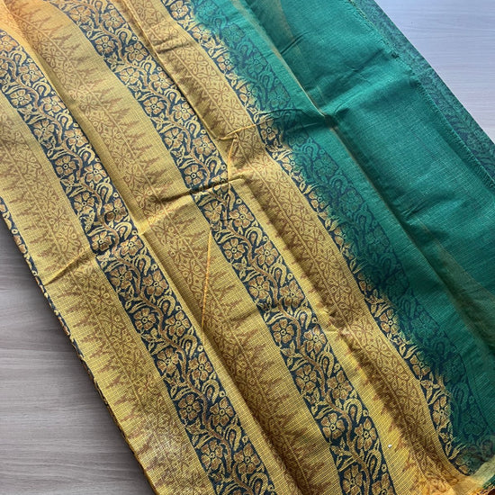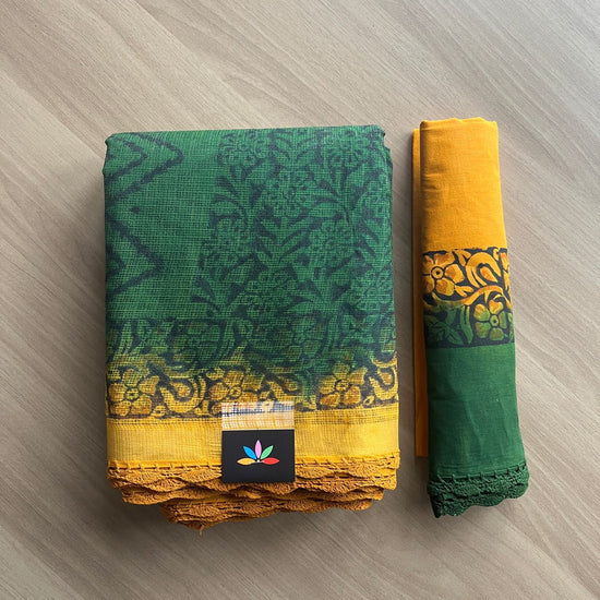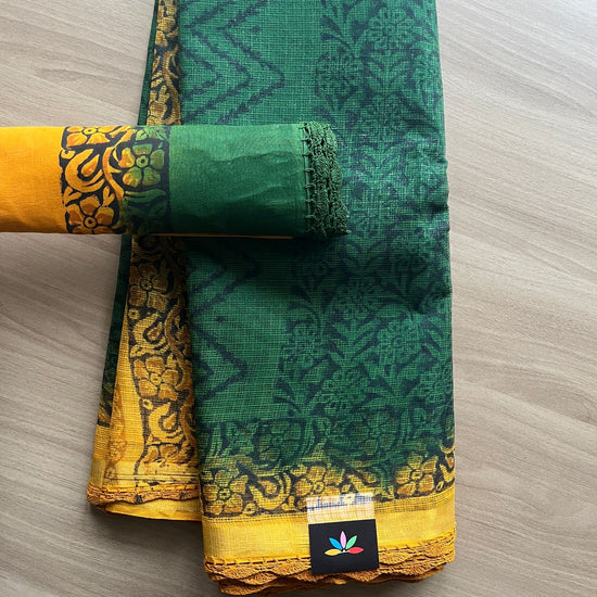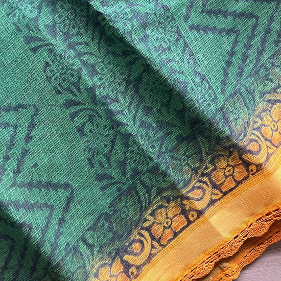 Handblock Printed Deep Green & Mustard Kota Saree with Crochet Border - 20615