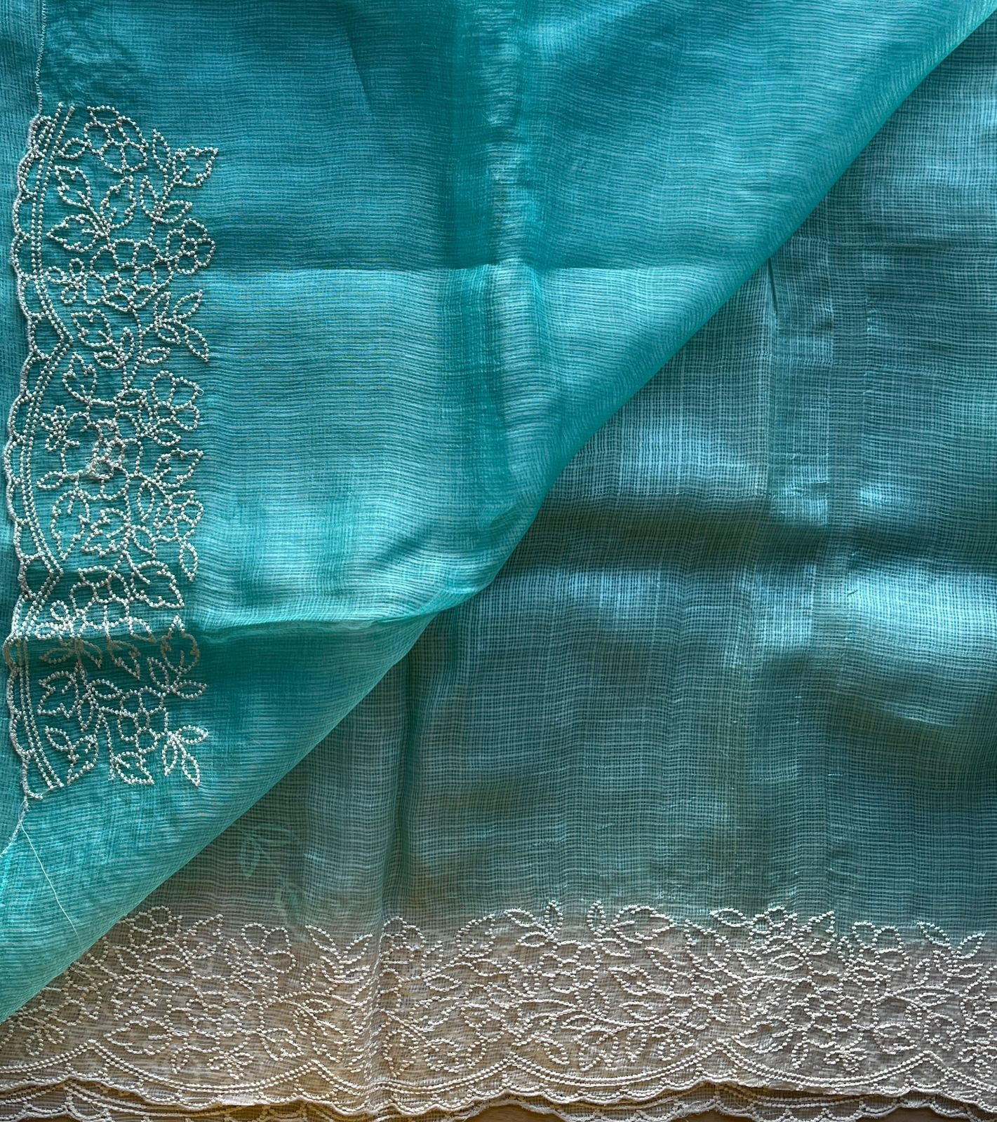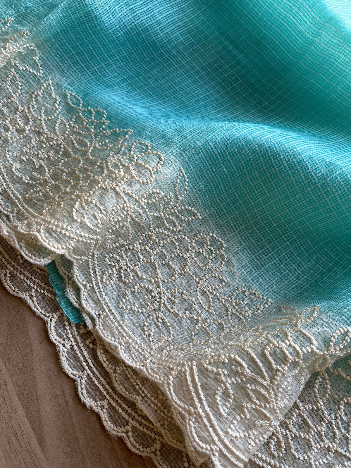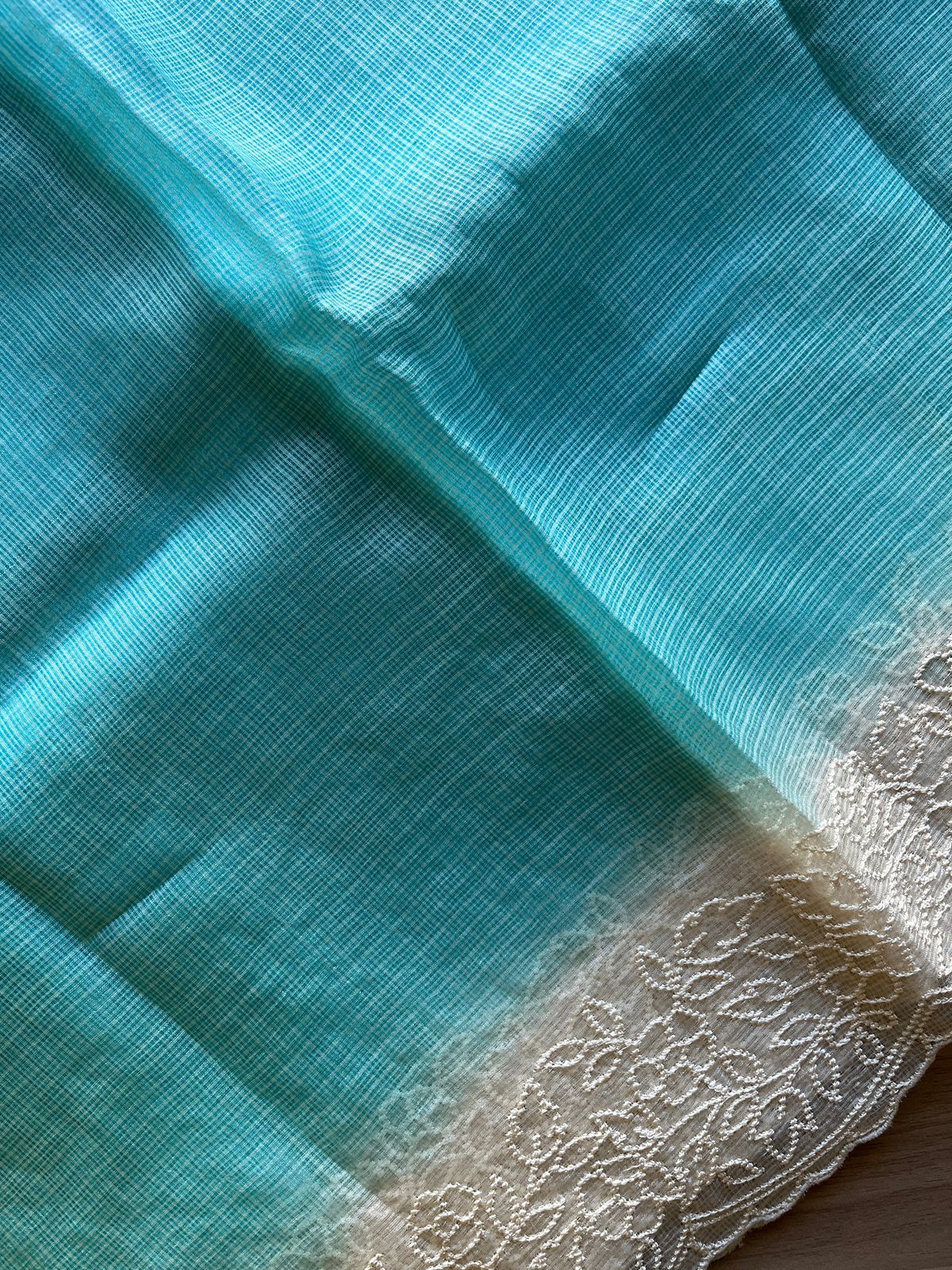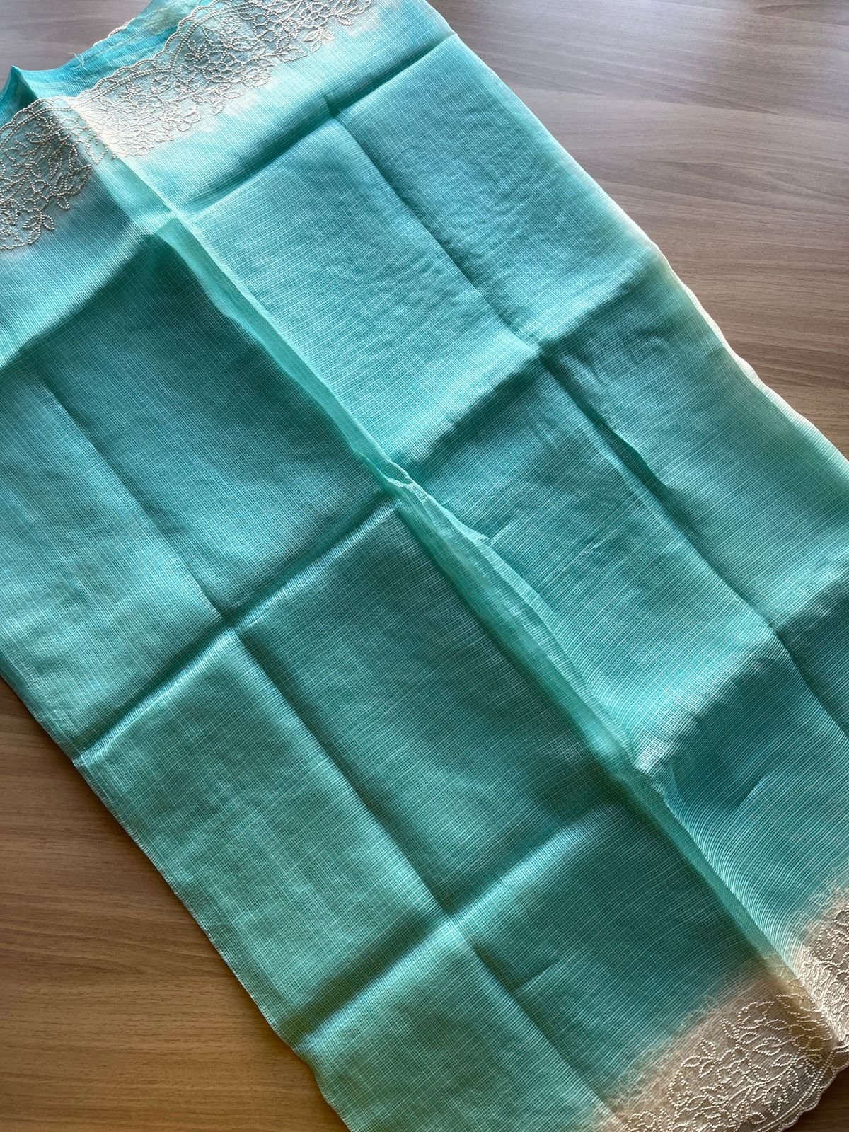 Aqua Blue Embroidered Scallop Border Tussar Kota Silk Saree