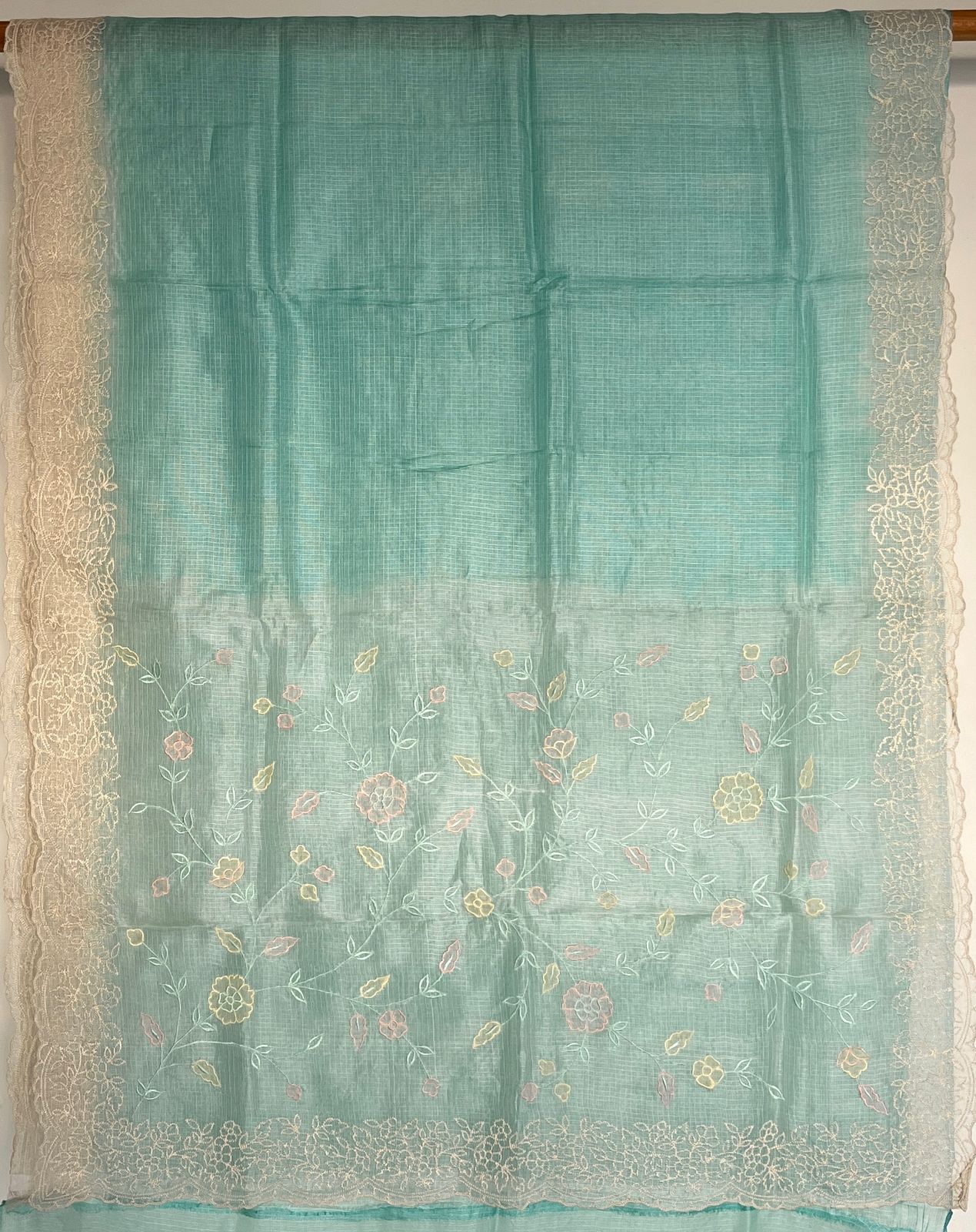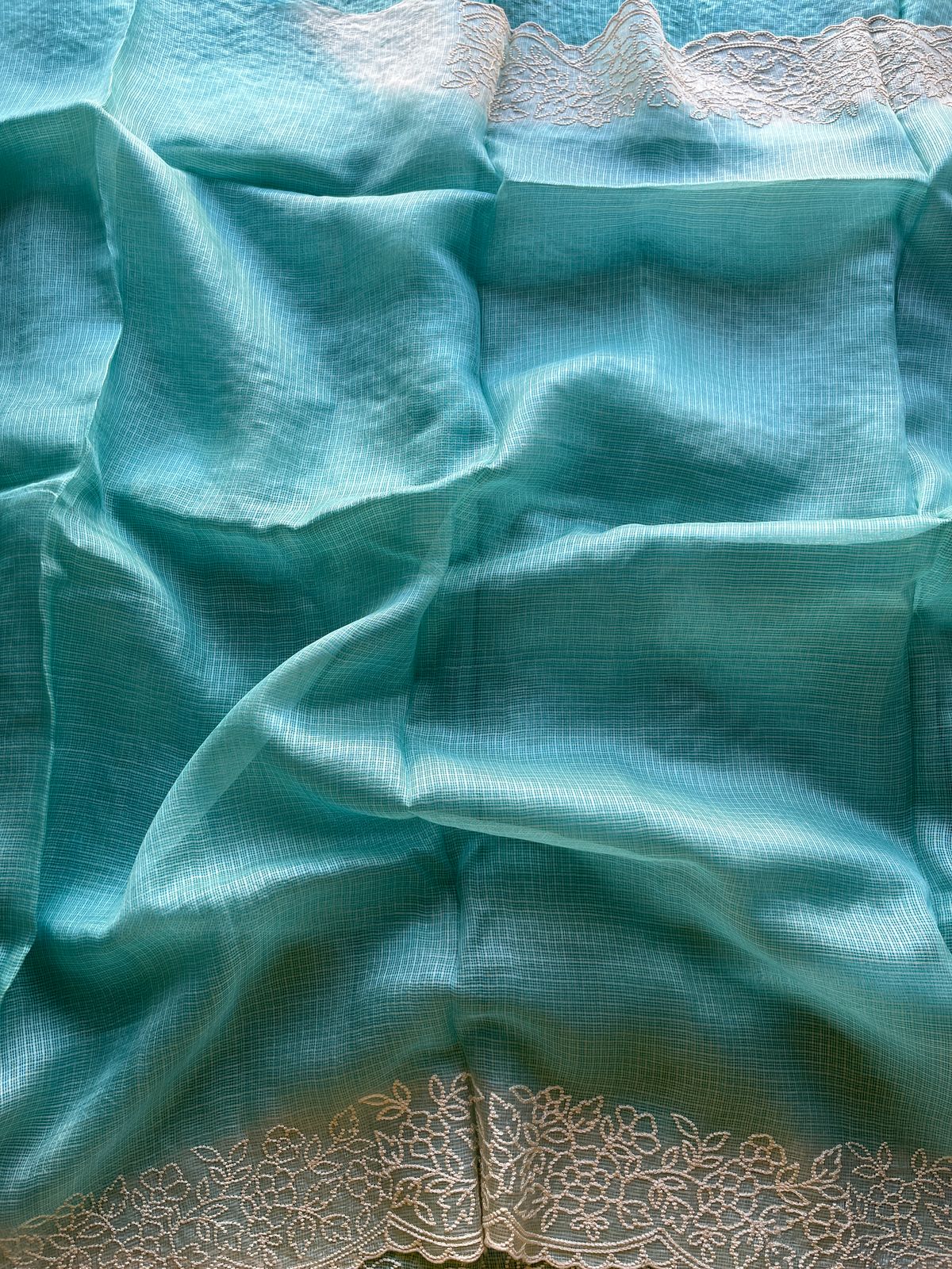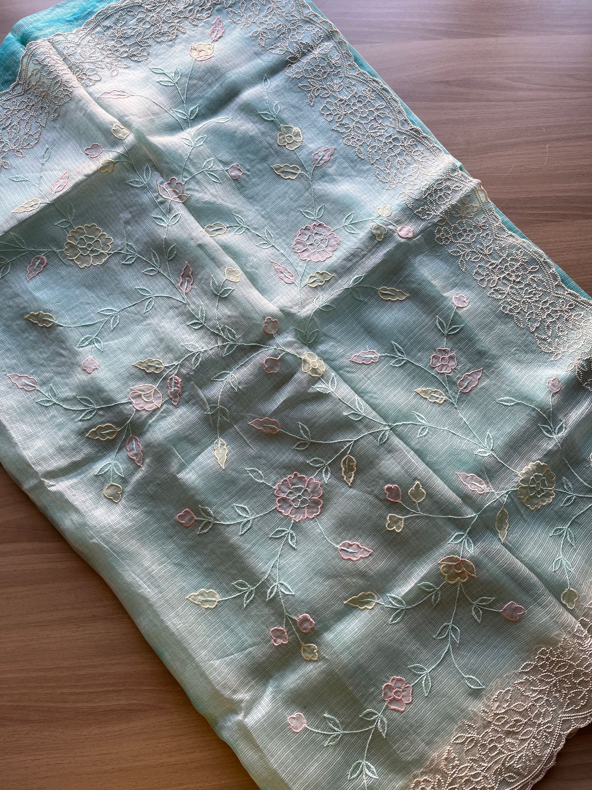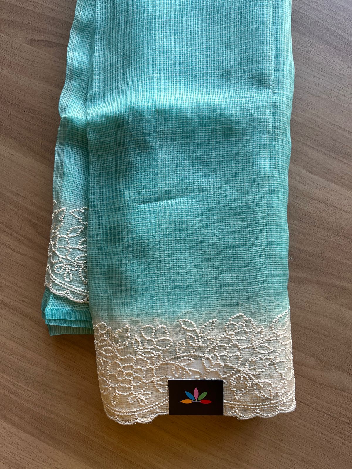 Aqua Blue Embroidered Scallop Border Tussar Kota Silk Saree