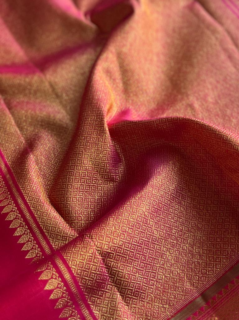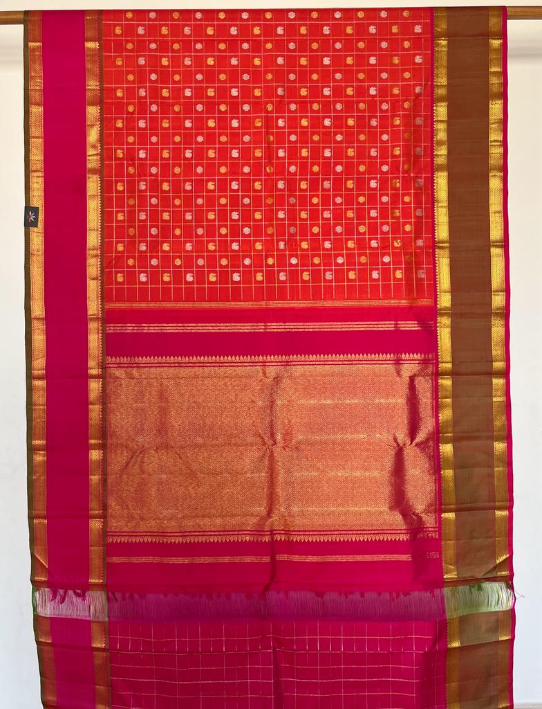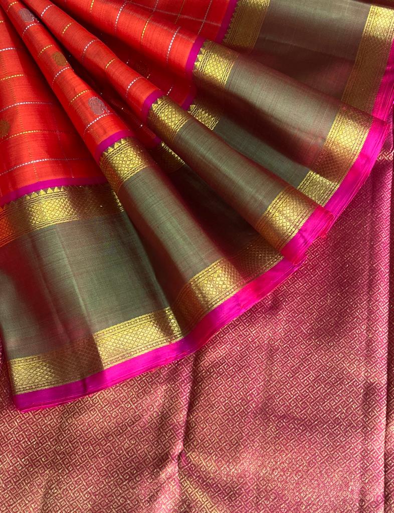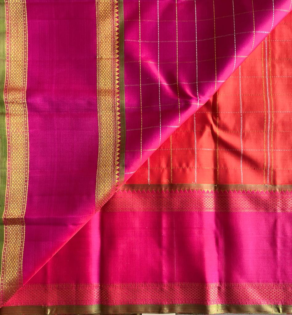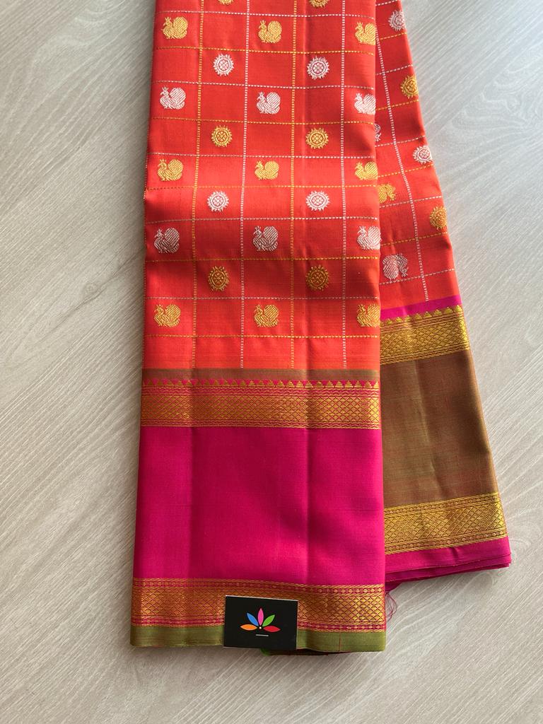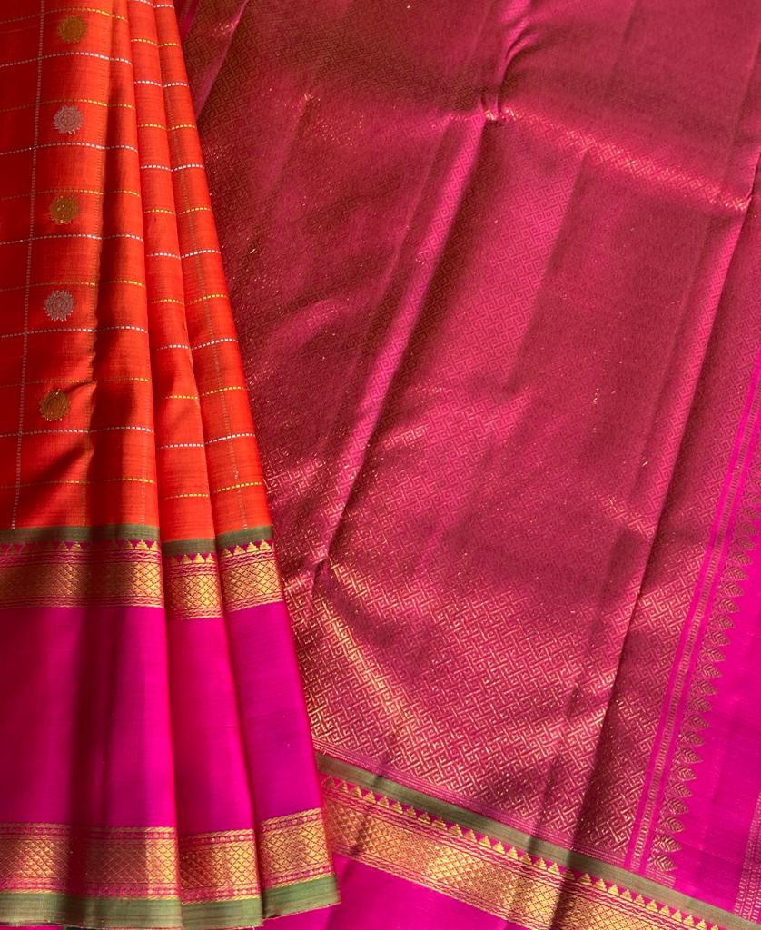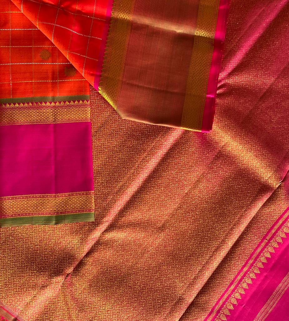 Colour : Body - ORANGE , Border - RANI PINK AND DUAL TONE GREEN GANGA JAMUNA BORDER