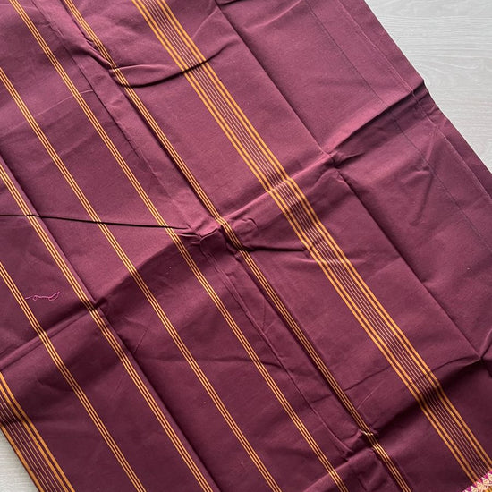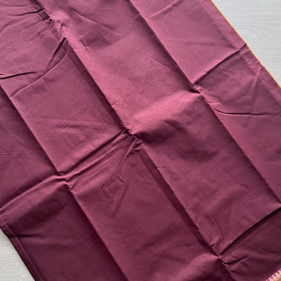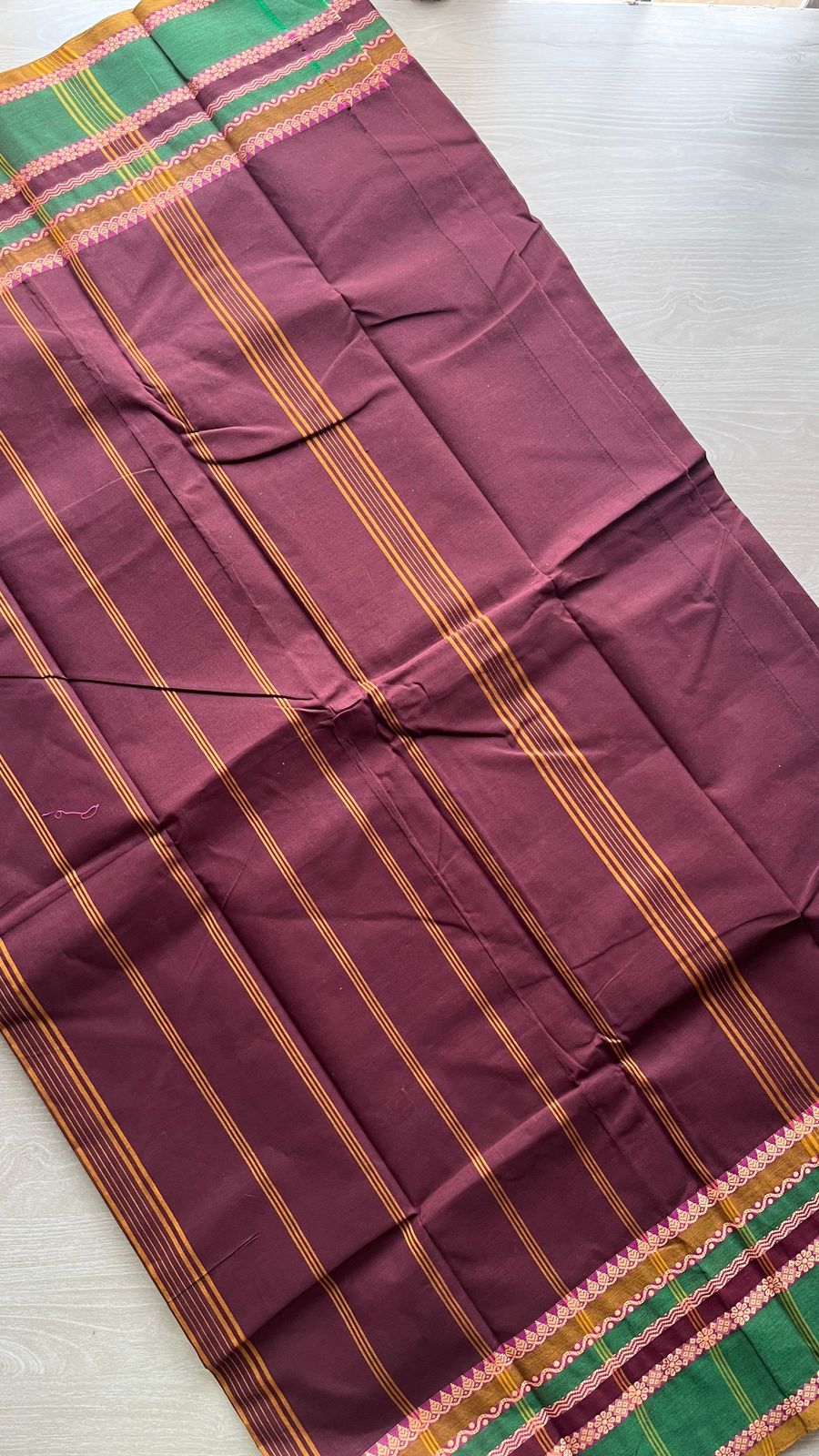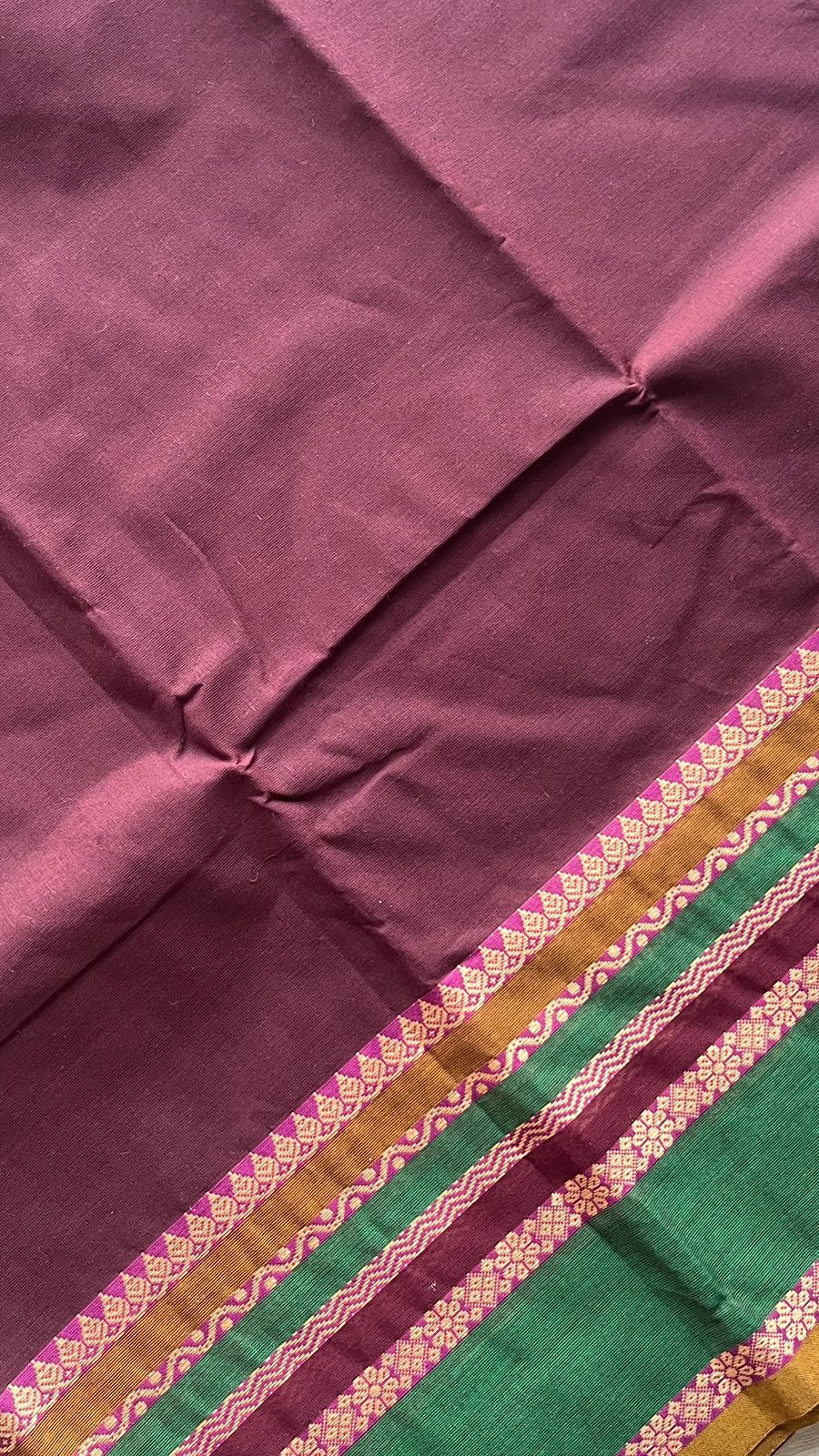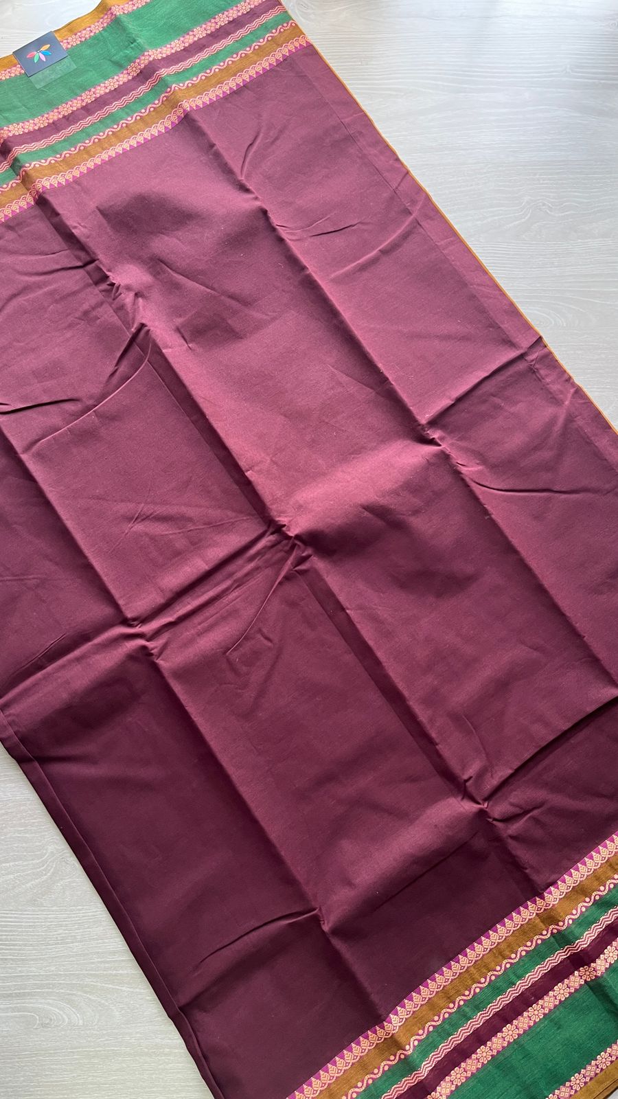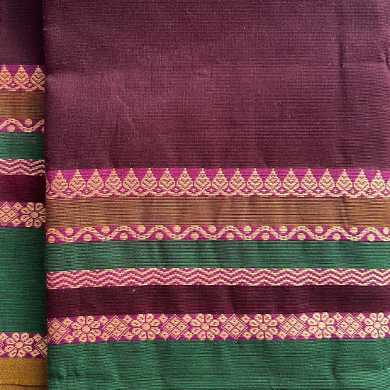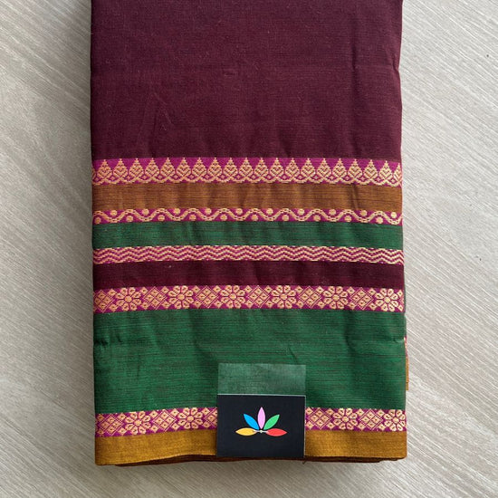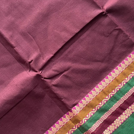 Wine Chettinad Cotton Saree with Contrast Green & Pink Border and Floral Detailing
