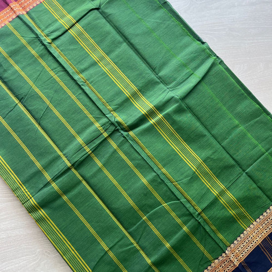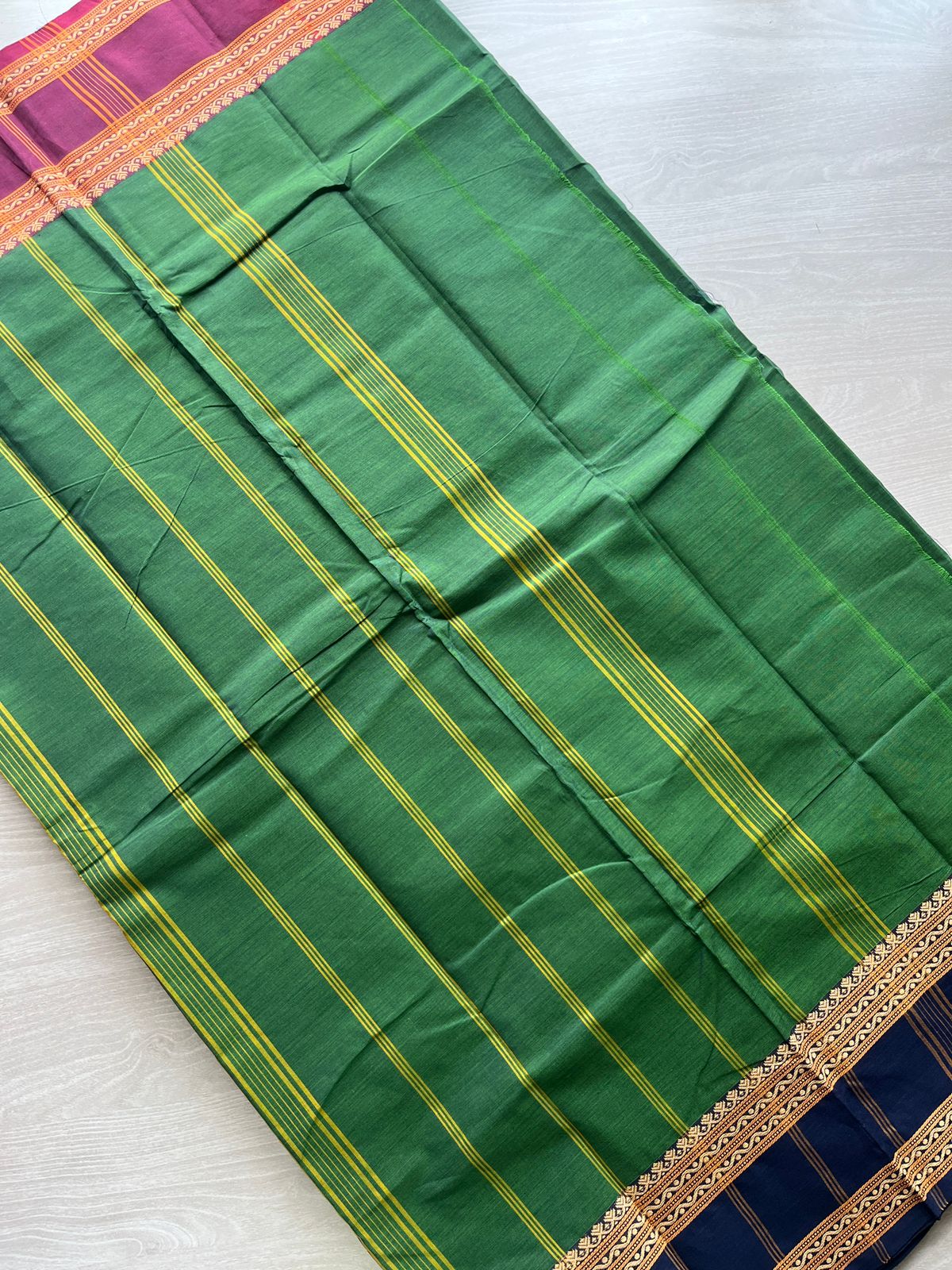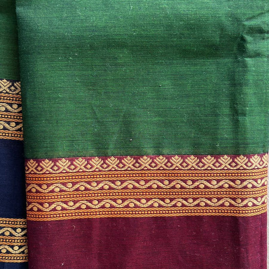 Emerald Green Chettinad Cotton Saree with Maroon and Blue Border