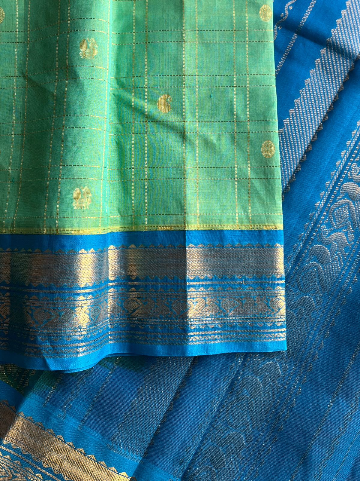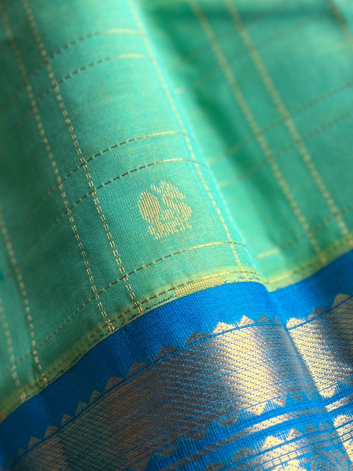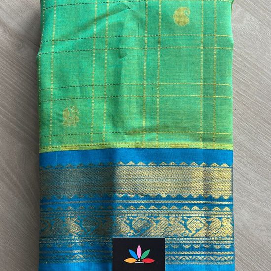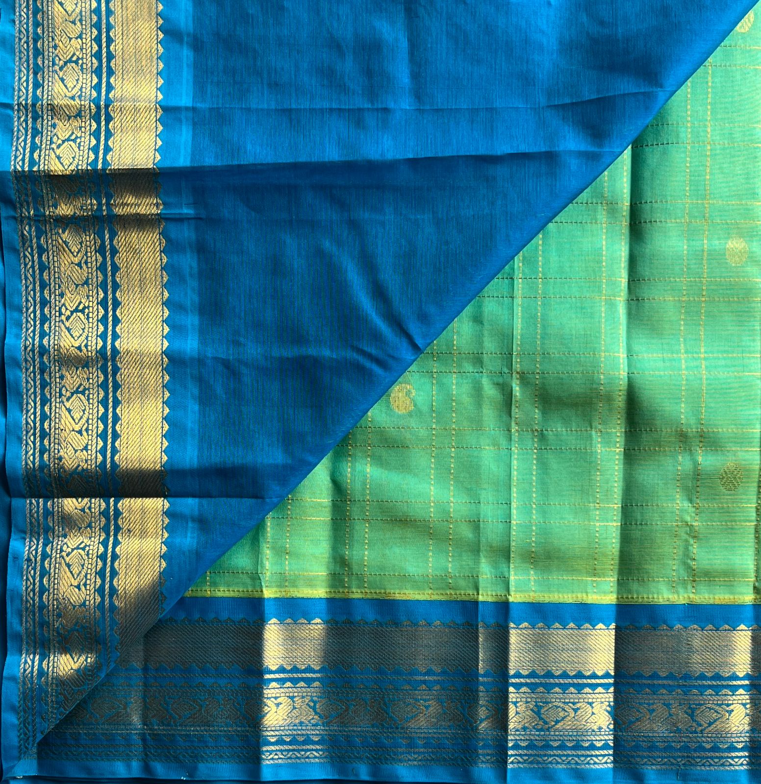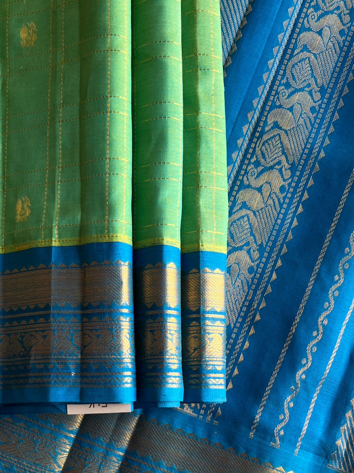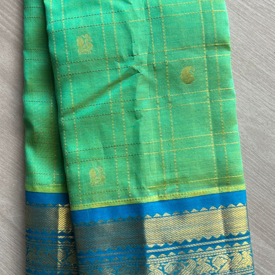 Zari Checked Silk Cotton Saree with Blue Contrast Korvai Border