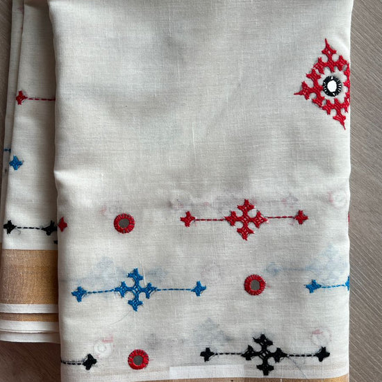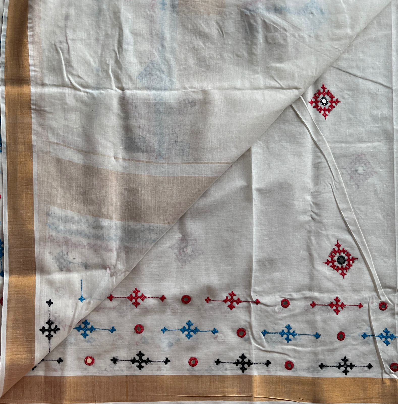 Gujarati Stitch with Kantha Stitch Kerala Cotton Saree