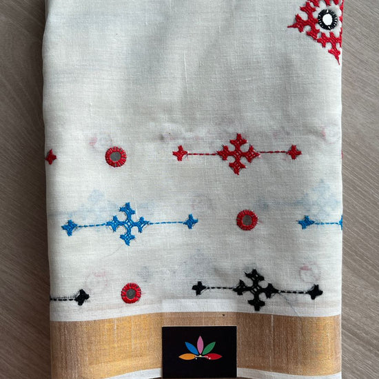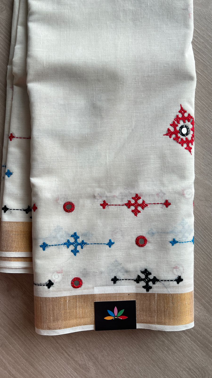 Gujarati Stitch with Kantha Stitch Kerala Cotton Saree -25821