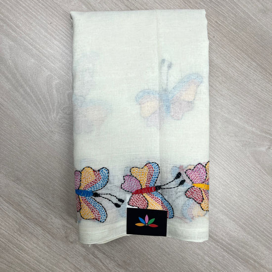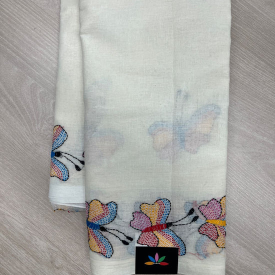 Handcrafted Kantha Embroidered Cotton Saree – Off-White with Multicolour Butterfly Motifs -23784