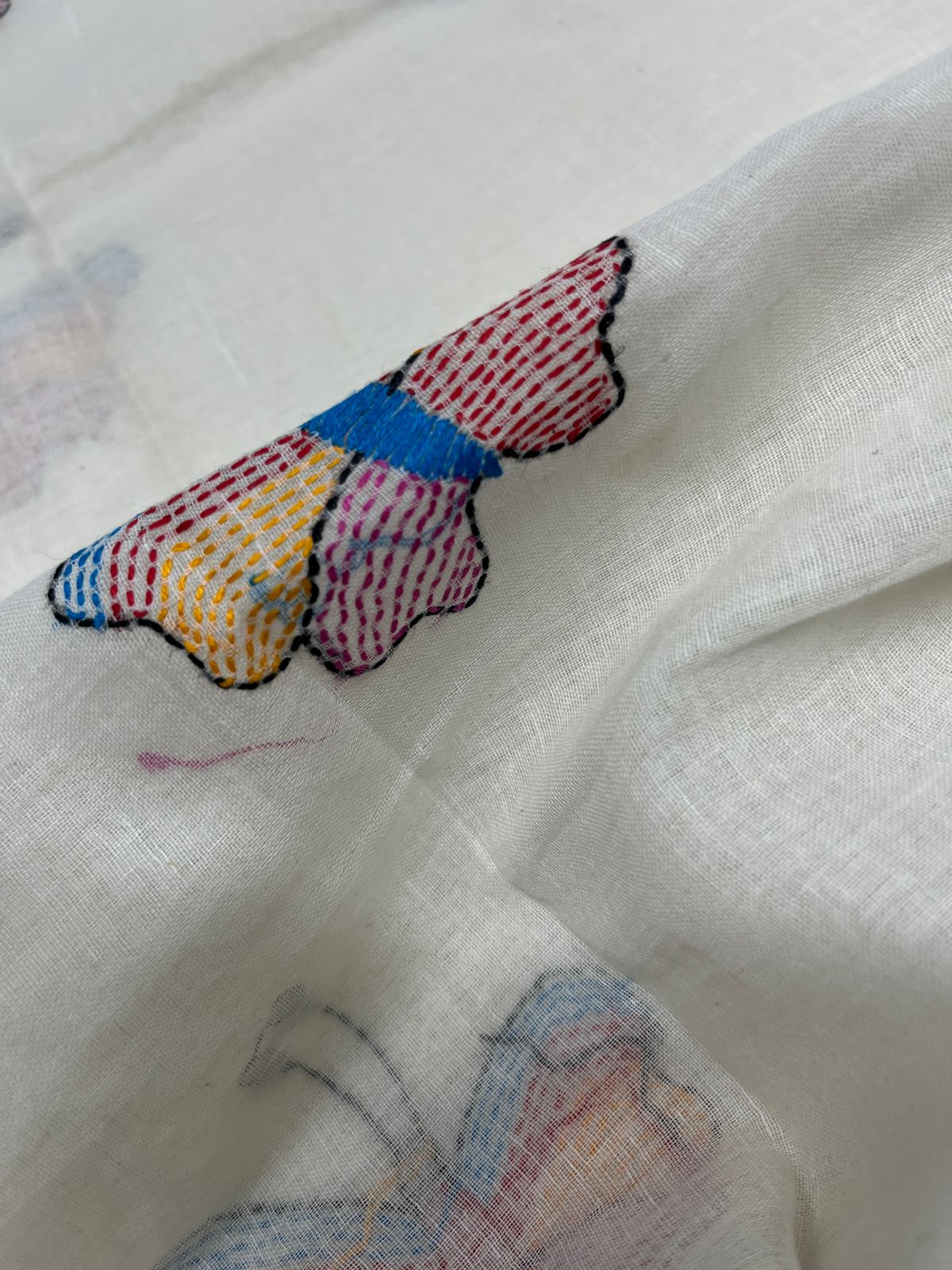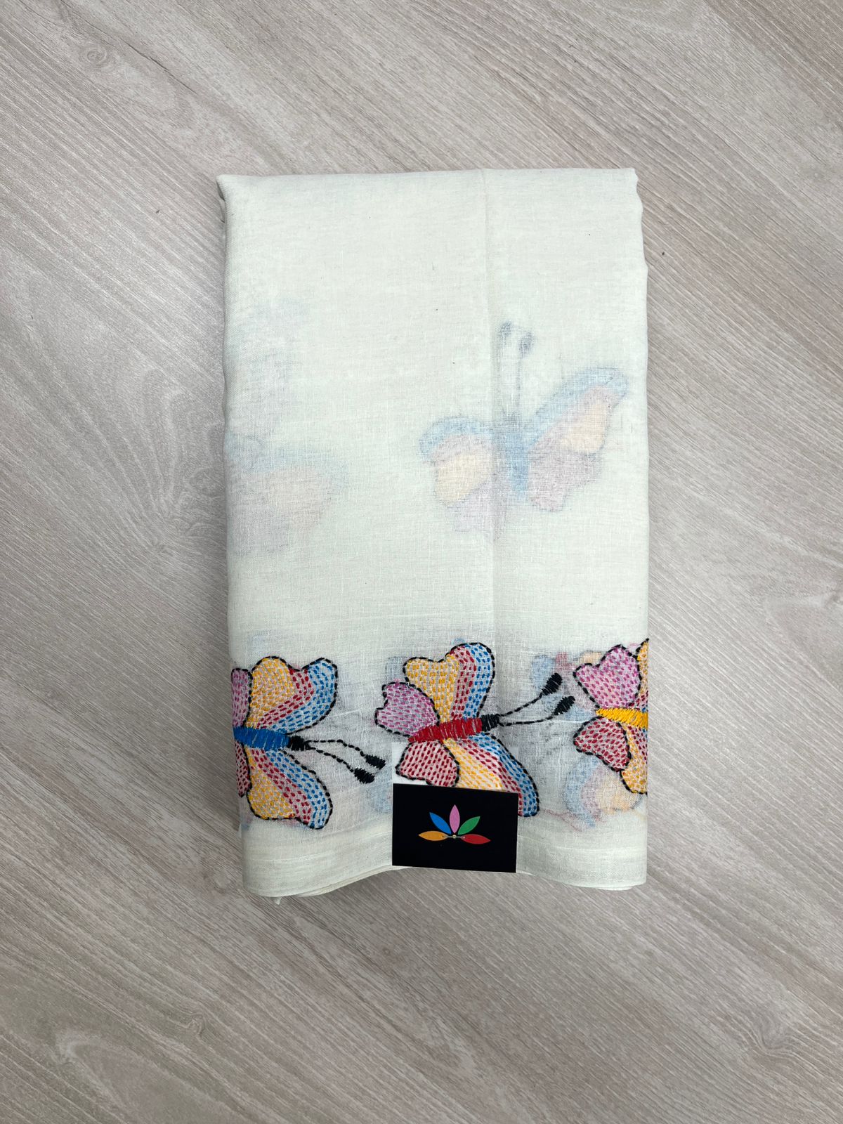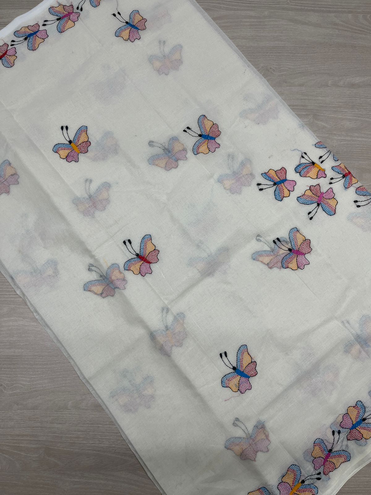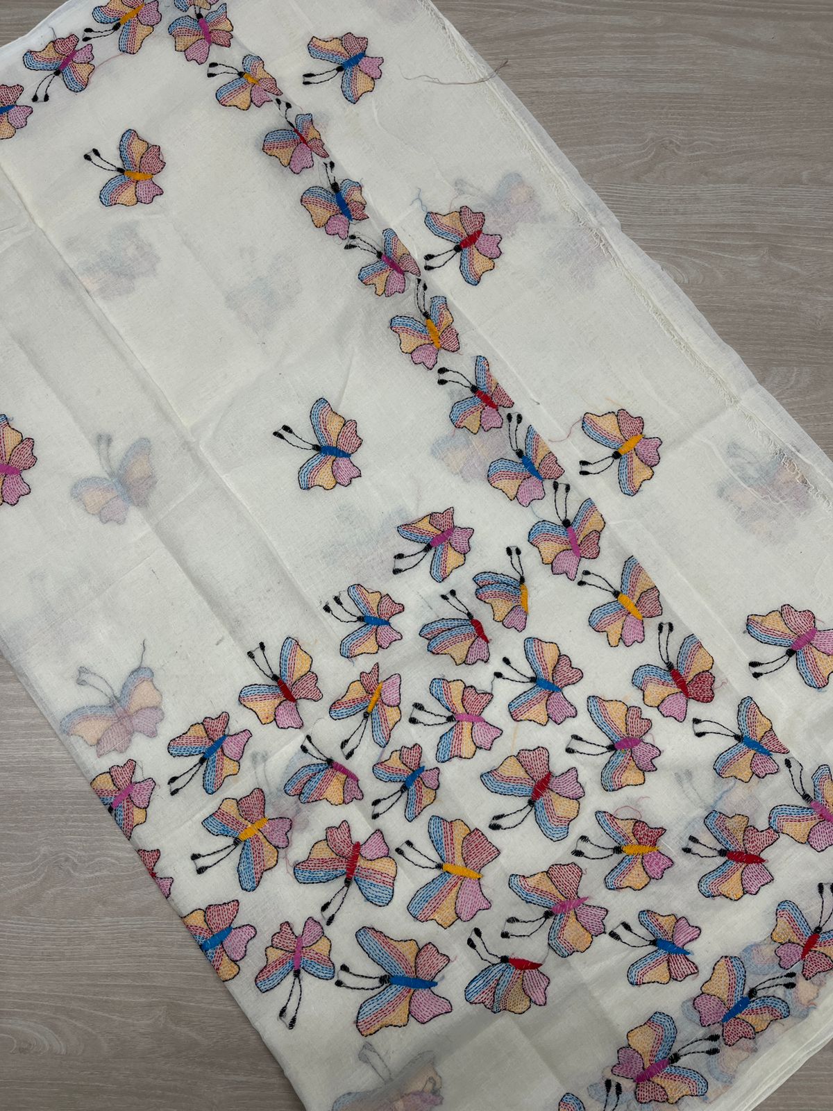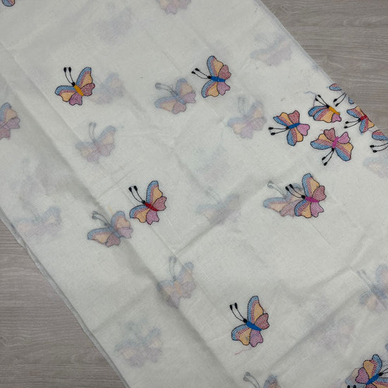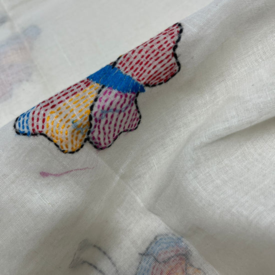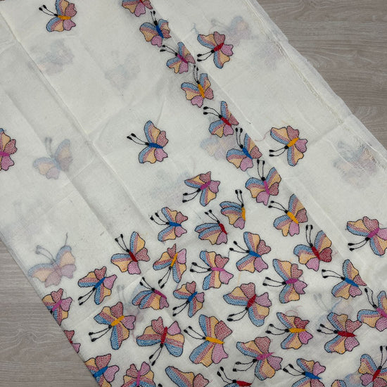 Handcrafted Kantha Embroidered Cotton Saree – Off-White with Multicolour Butterfly Motifs