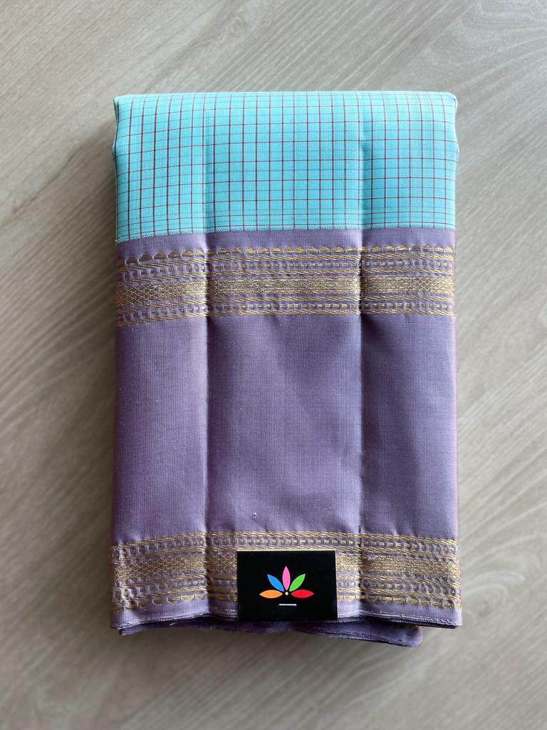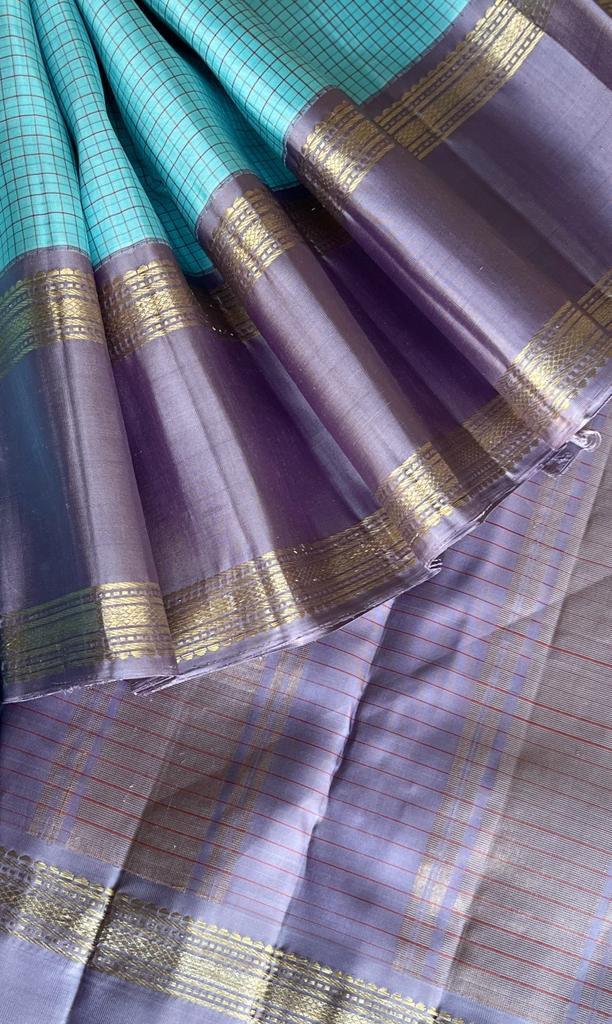 Color: Arctic Blue with Magenta Checks and Contrast Lilac Border with Gold Zari