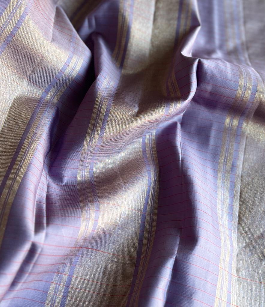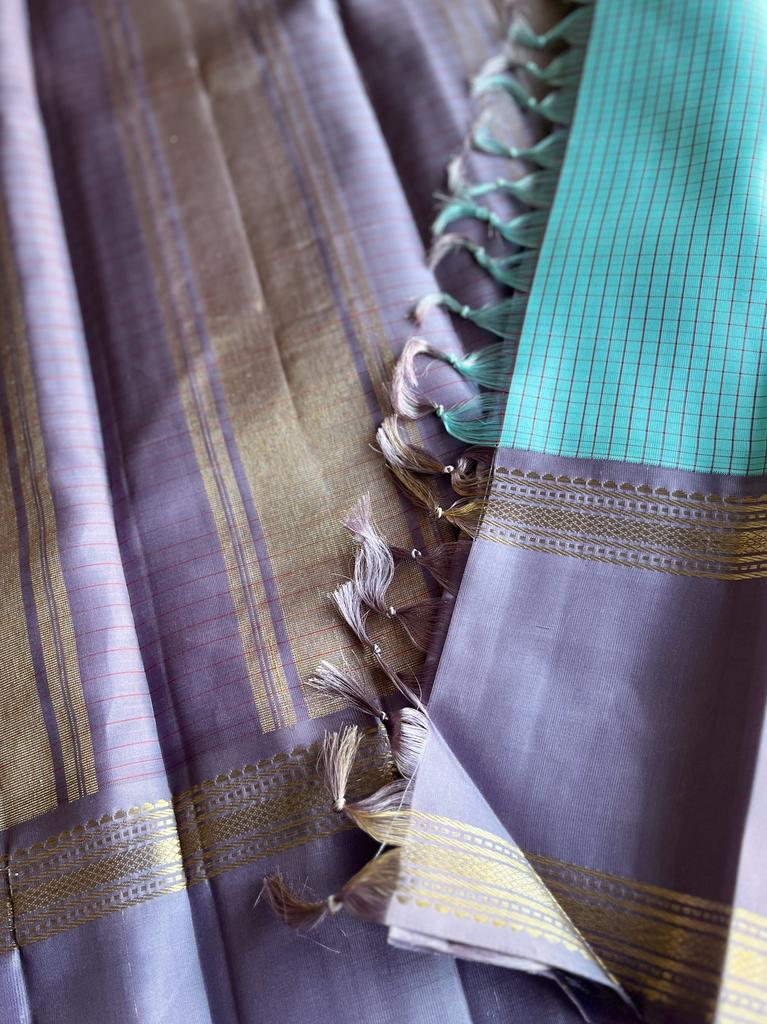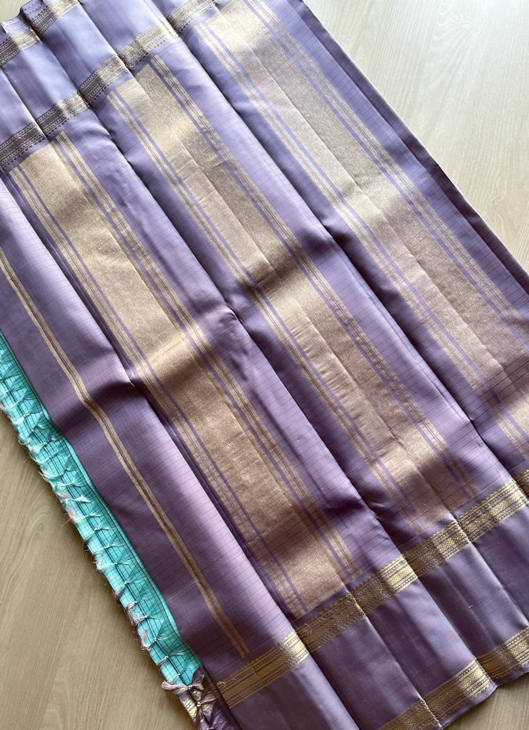 A subtle symphony of cool tones and classic craftsmanship, this Handwoven Kancheevaram Silk Saree is elegance redefined. The body features a refreshing Arctic Blue hue, gracefully patterned with fine magenta windowpane checks, offering a structured and contemporary aesthetic. The saree is beautifully finished with a contrasting lilac border and lower half, delicately woven with gold zari motifs, adding a soft shimmer and regal finish.