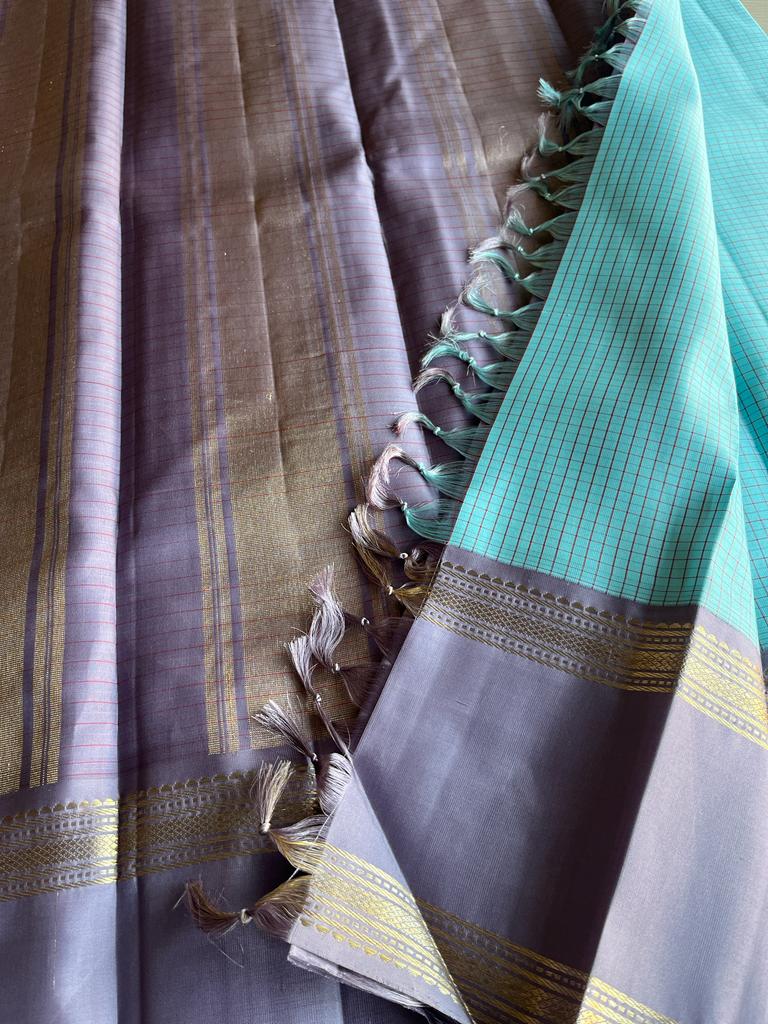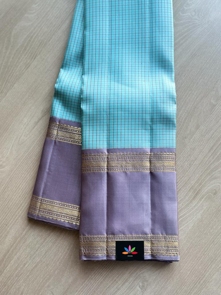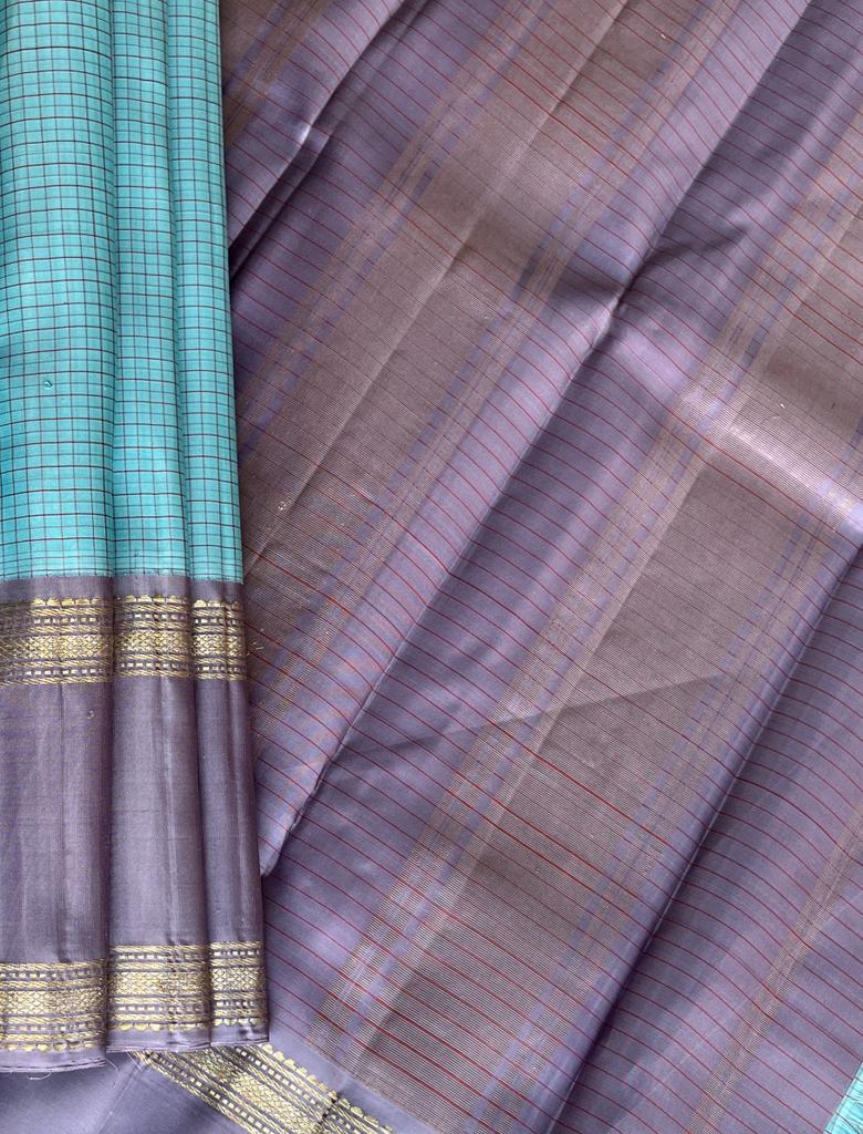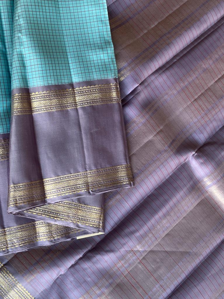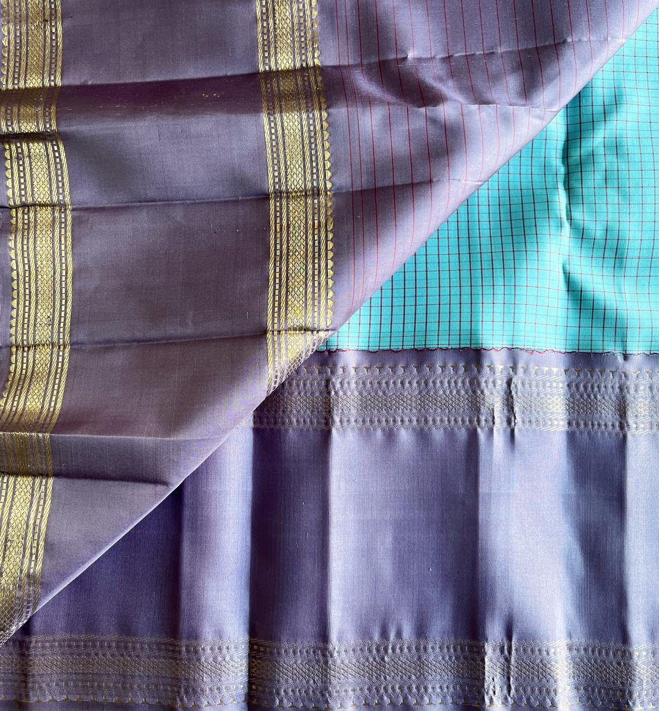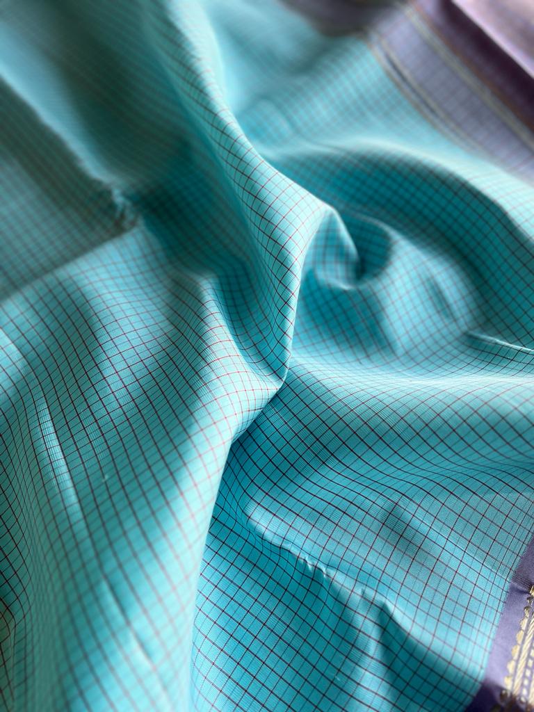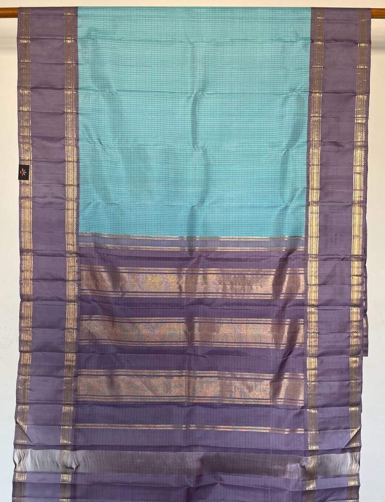 Handwoven Checked Kancheevaram Silk Saree in Arctic Blue and Lilac - 116
