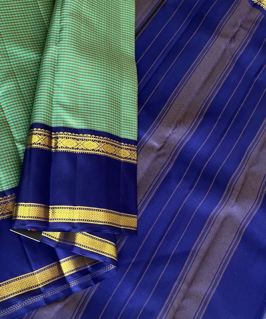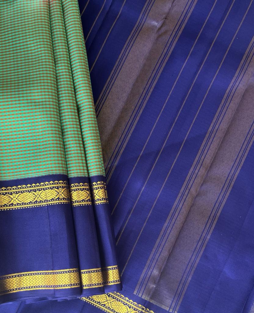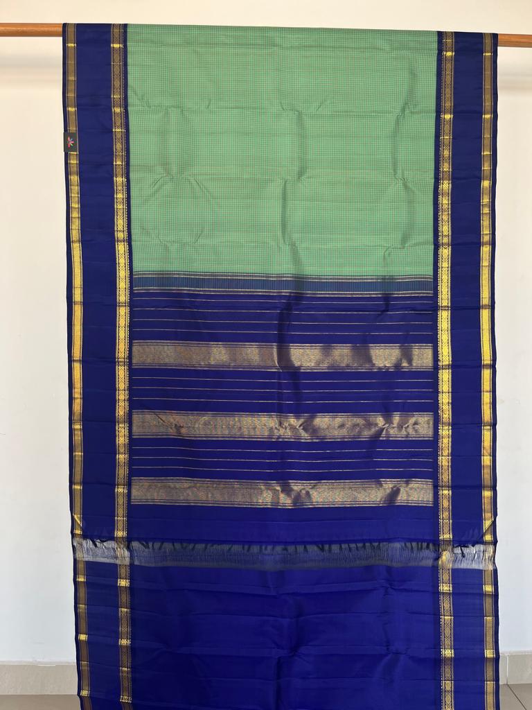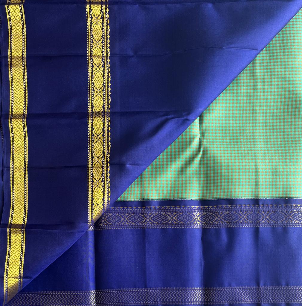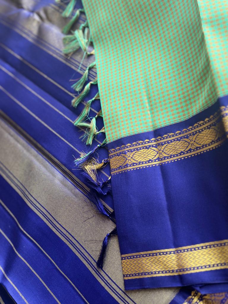 Handwoven Checked Kancheevaram Silk Saree in Mint Green and Royal Blue -142