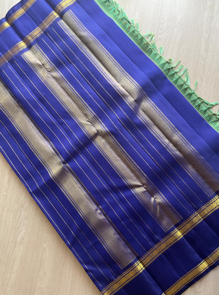 Step into timeless elegance with this captivating Handwoven Kancheevaram Silk Saree, combining soft freshness with regal depth. The body features a charming mint green base patterned with rust-orange micro checks, lending it a playful yet classic appeal. The contrasting royal blue border and pallu are adorned with intricately woven gold zari motifs, adding richness and grandeur to the overall look.