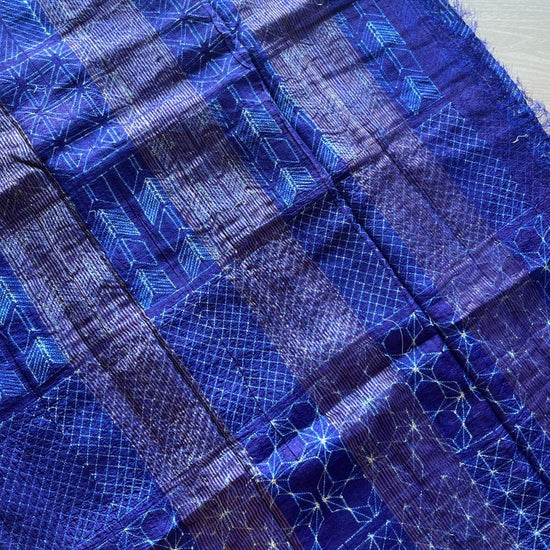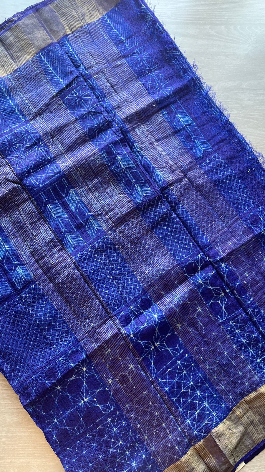 Each saree is carefully hand-dyed using the needle shibori technique, where artisans create delicate geometric patterns through meticulous stitching and resist-dyeing.