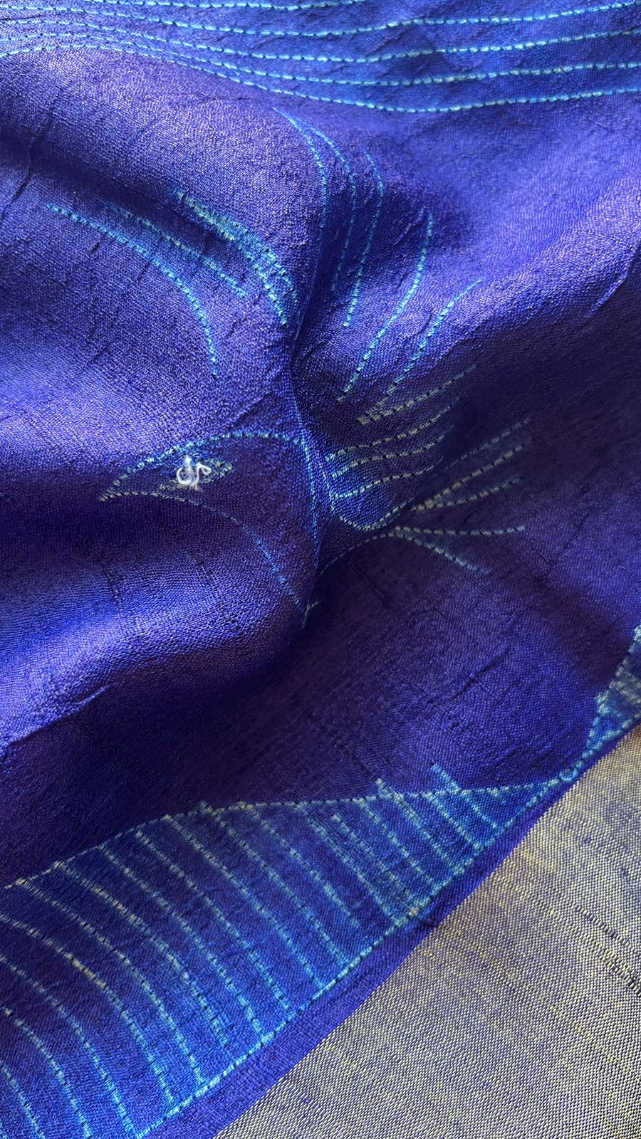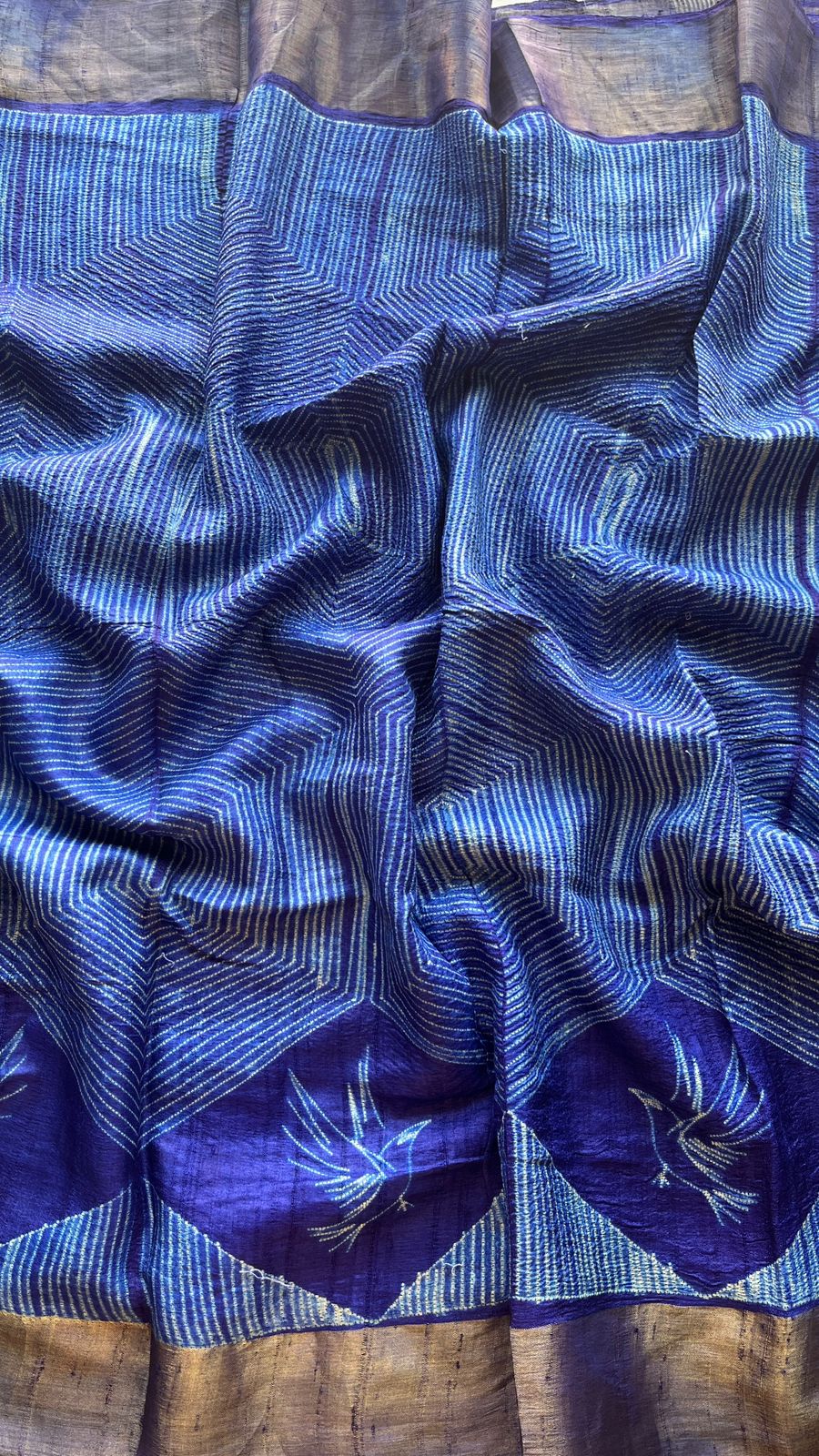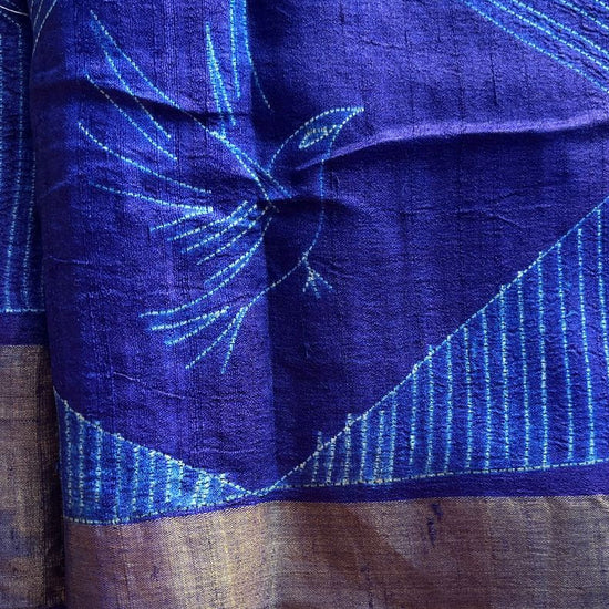 Woven from premium Tussar silk, it offers a soft, natural texture with a subtle sheen. The deep indigo base is highlighted by intricate white line motifs and graceful bird designs along the border, symbolizing peace and freedom.
