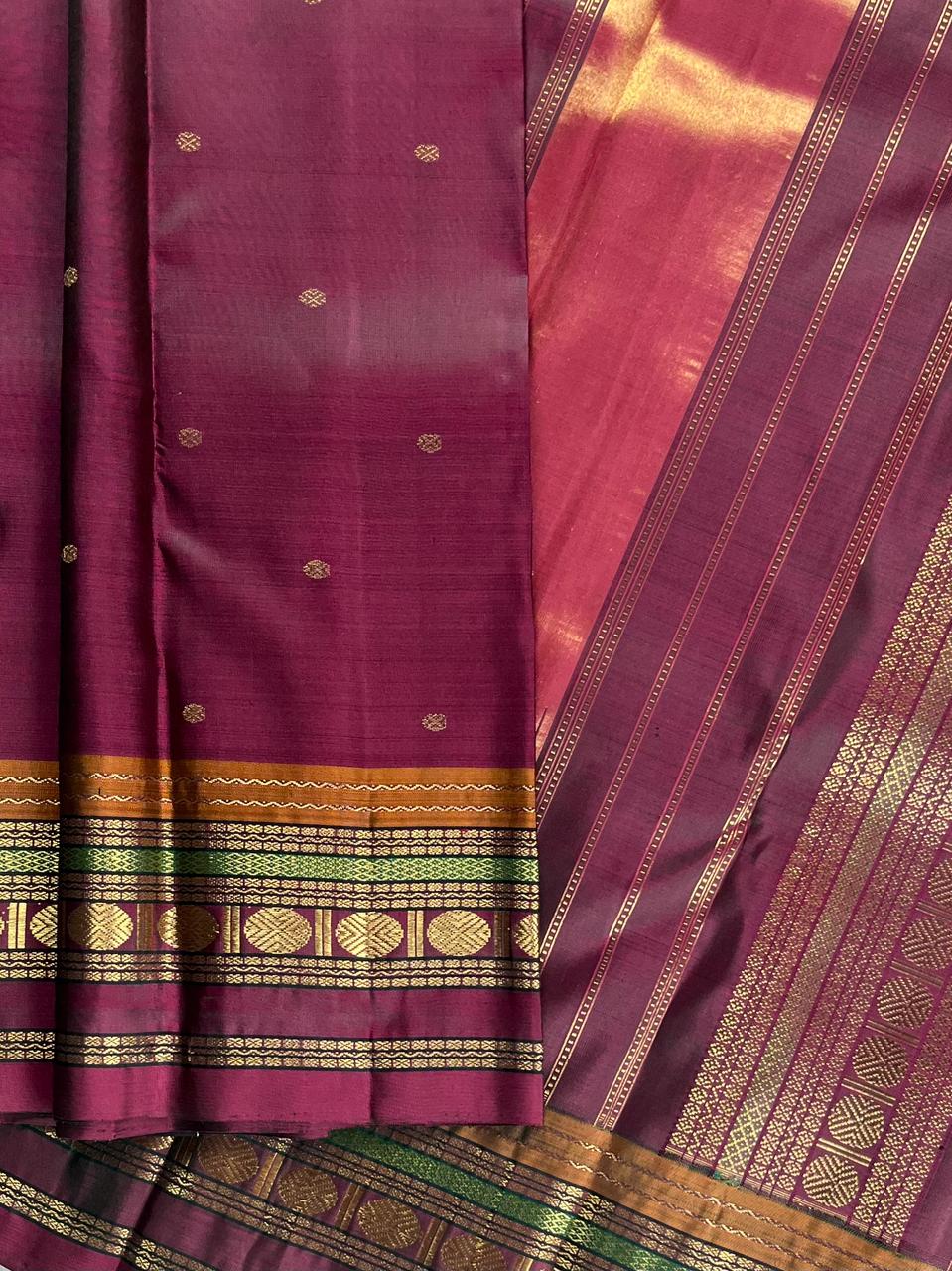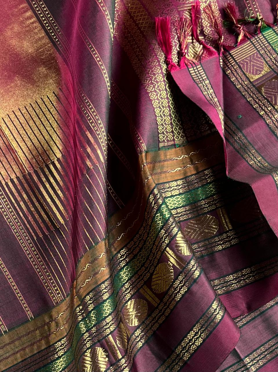 This saree has been weaved using the traditional adai technique. The Adai technique is an ancient and traditional method used to embellish Kanjeevarams. This skilled weaving technique allows making of intricate patterns such as form of motifs within motifs or much more complex design patterns.