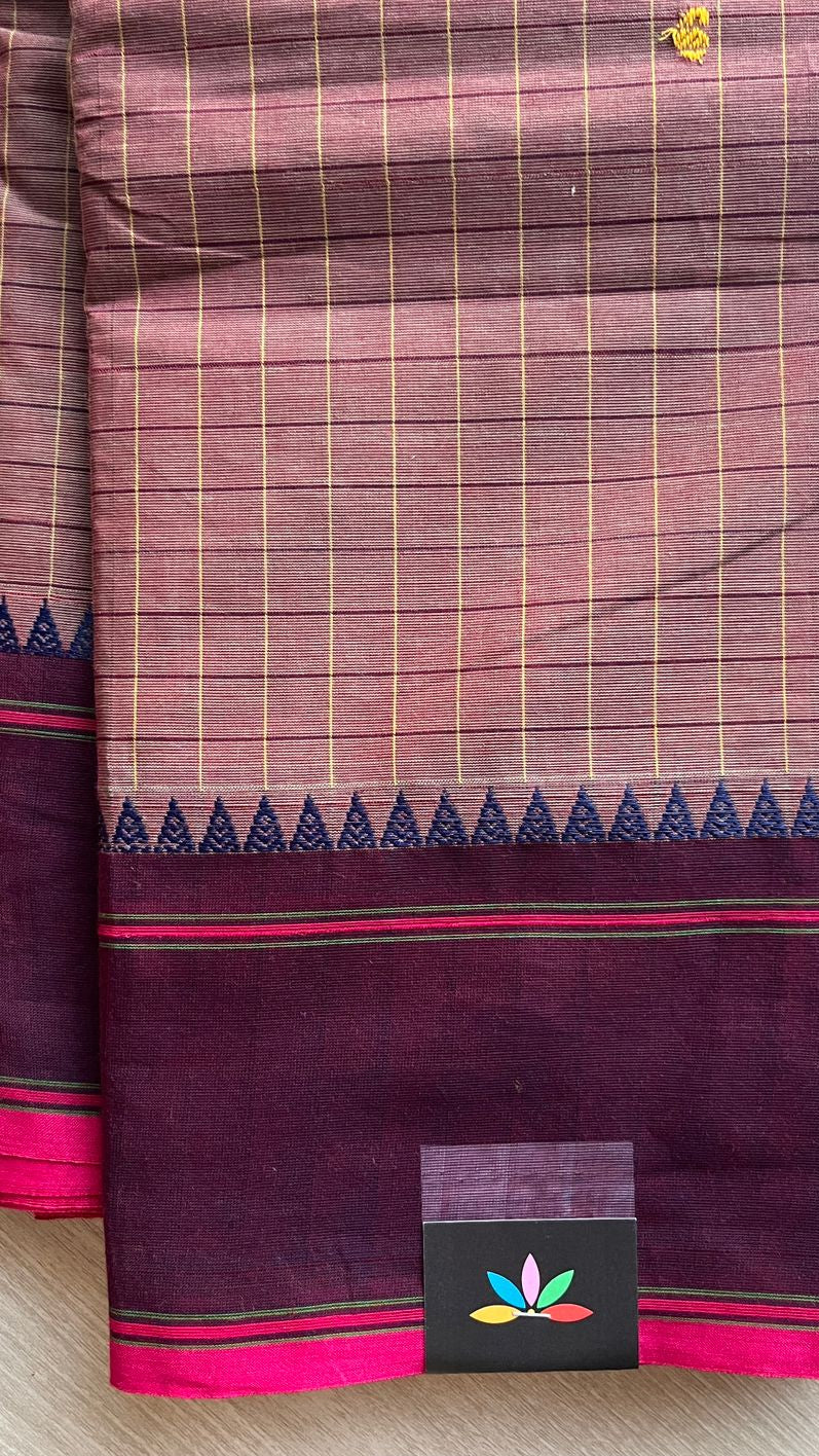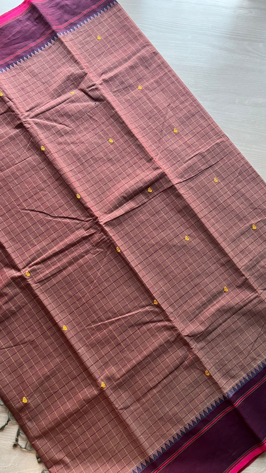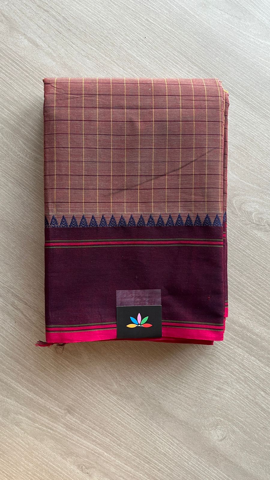 Rose Brown Checked Chettinad Cotton Saree with Wine and Pink Border