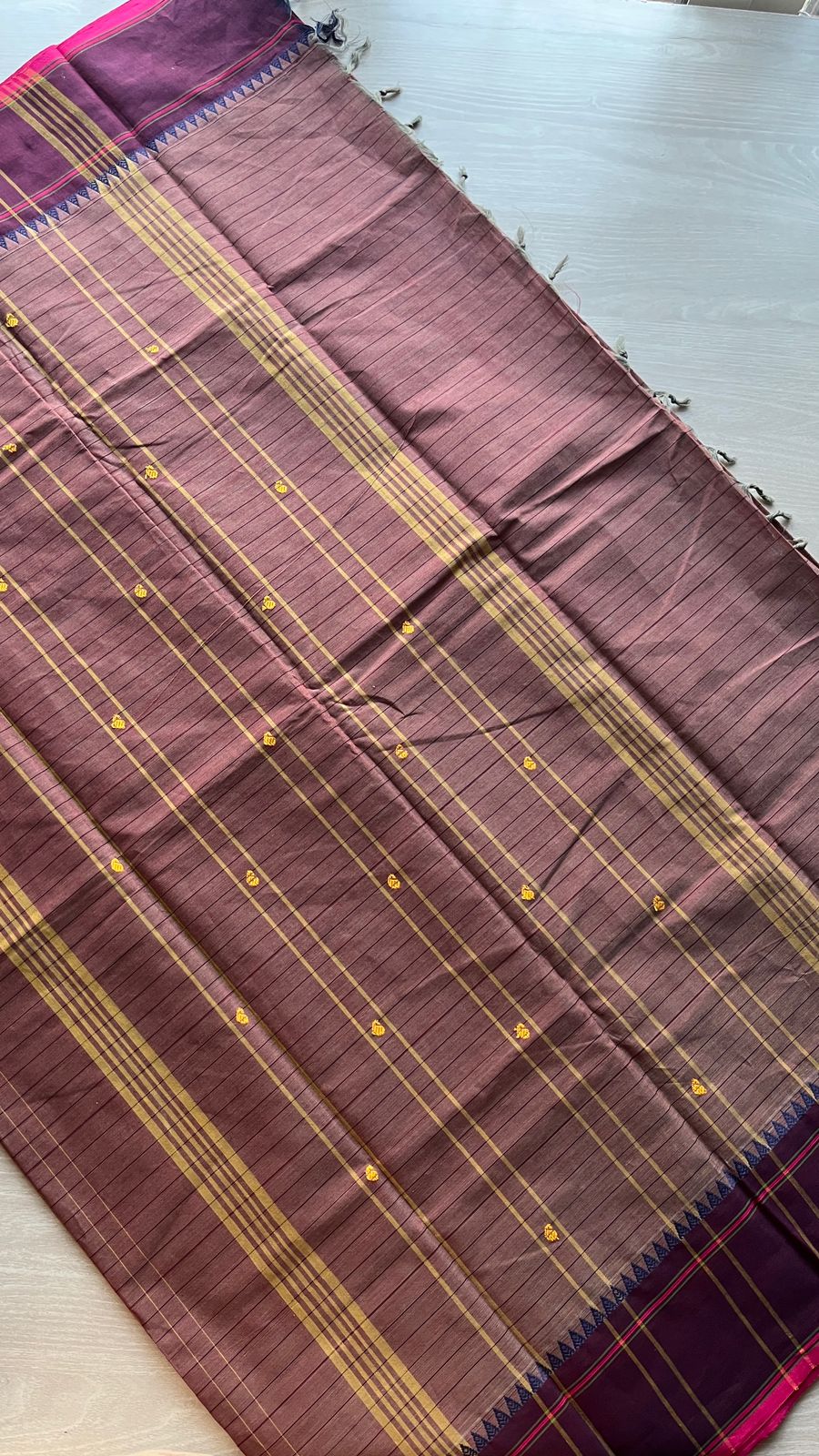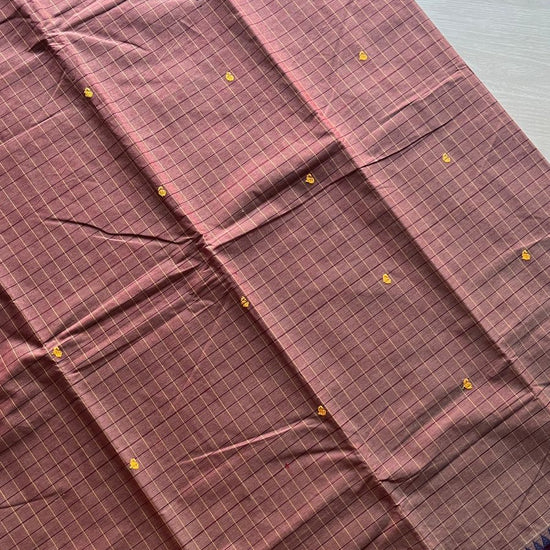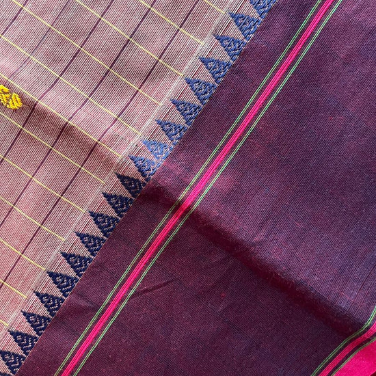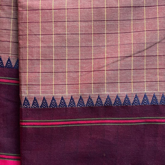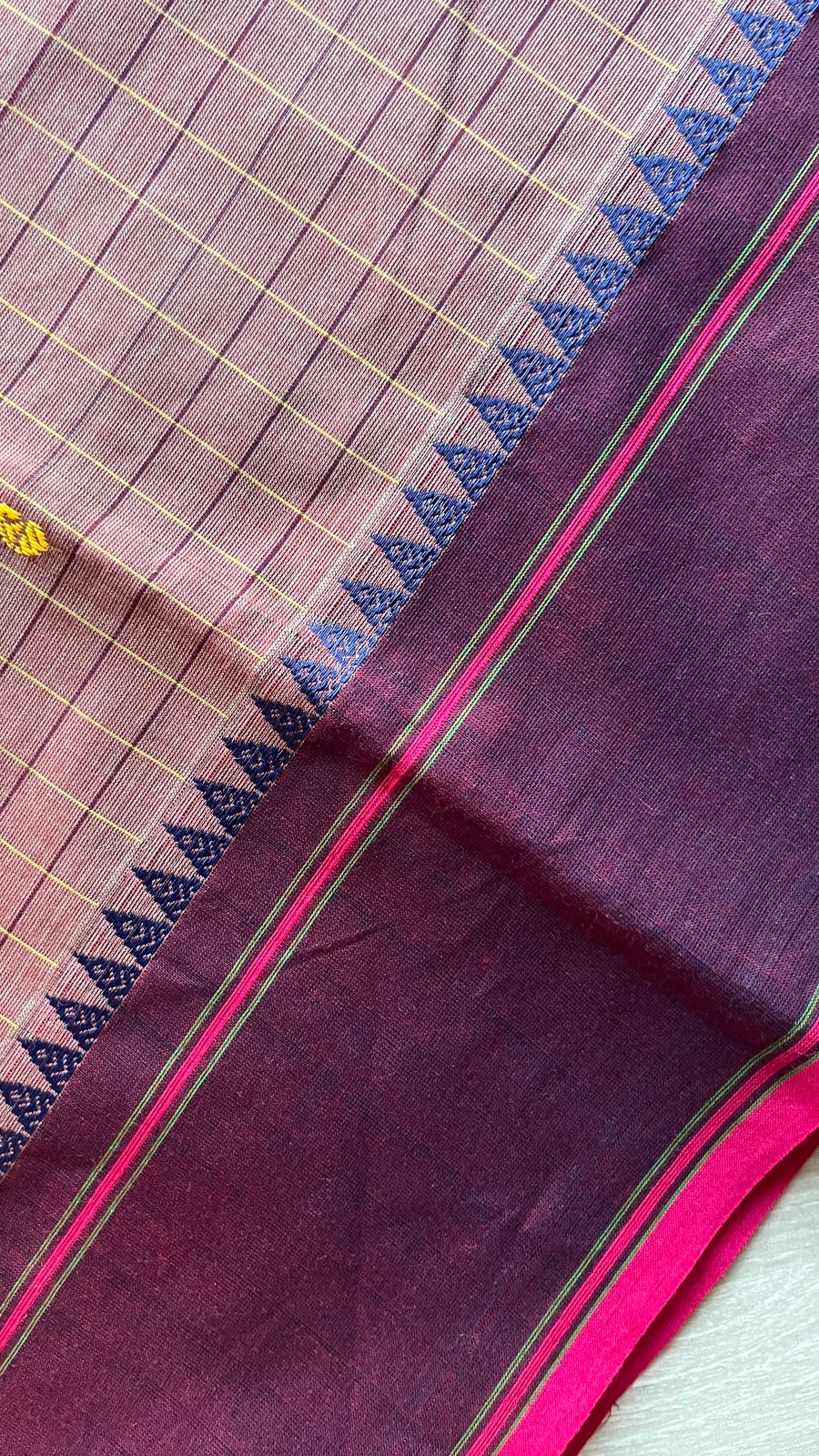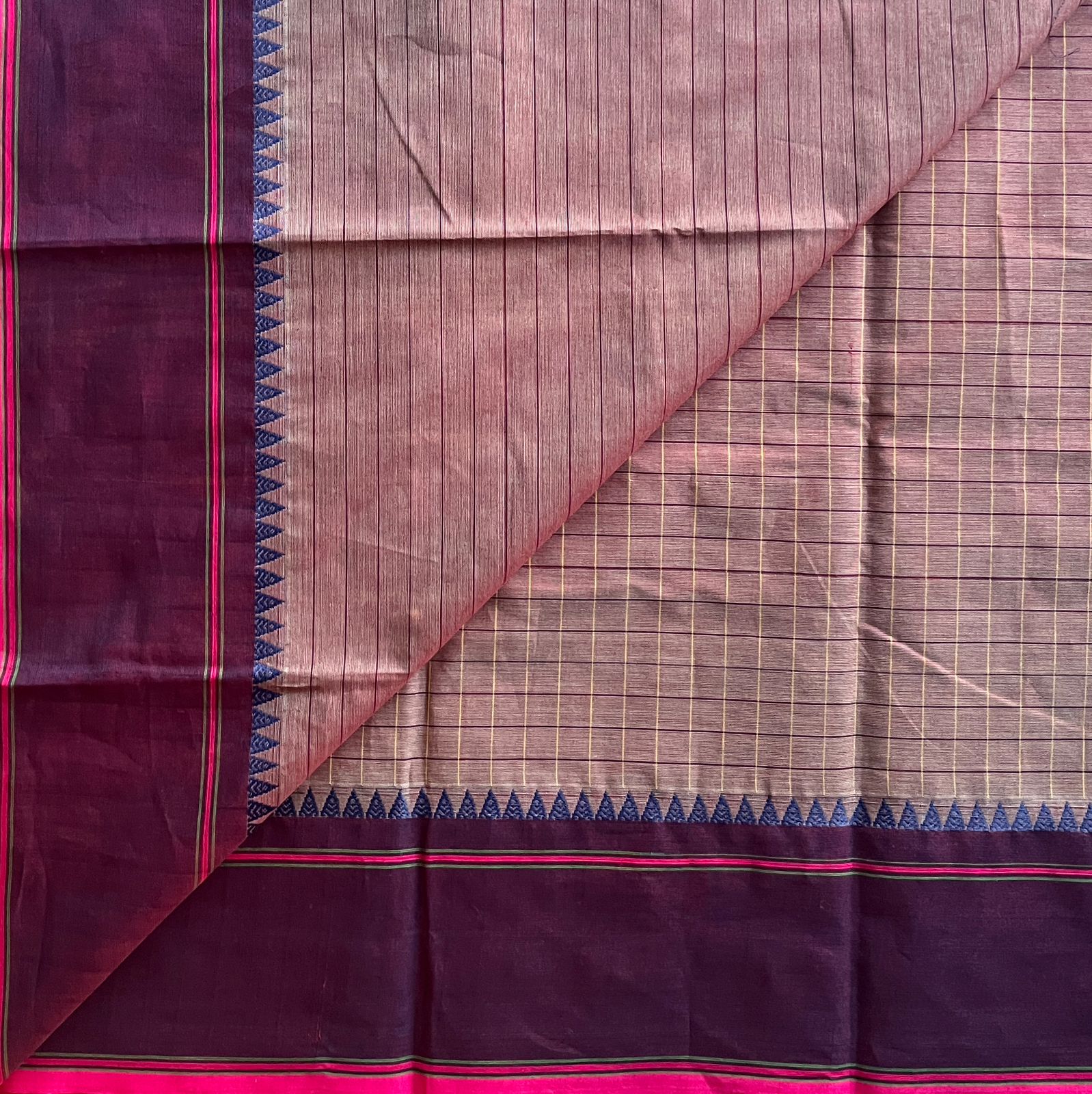 Rose Brown Checked Chettinad Cotton Saree with Wine and Pink Border