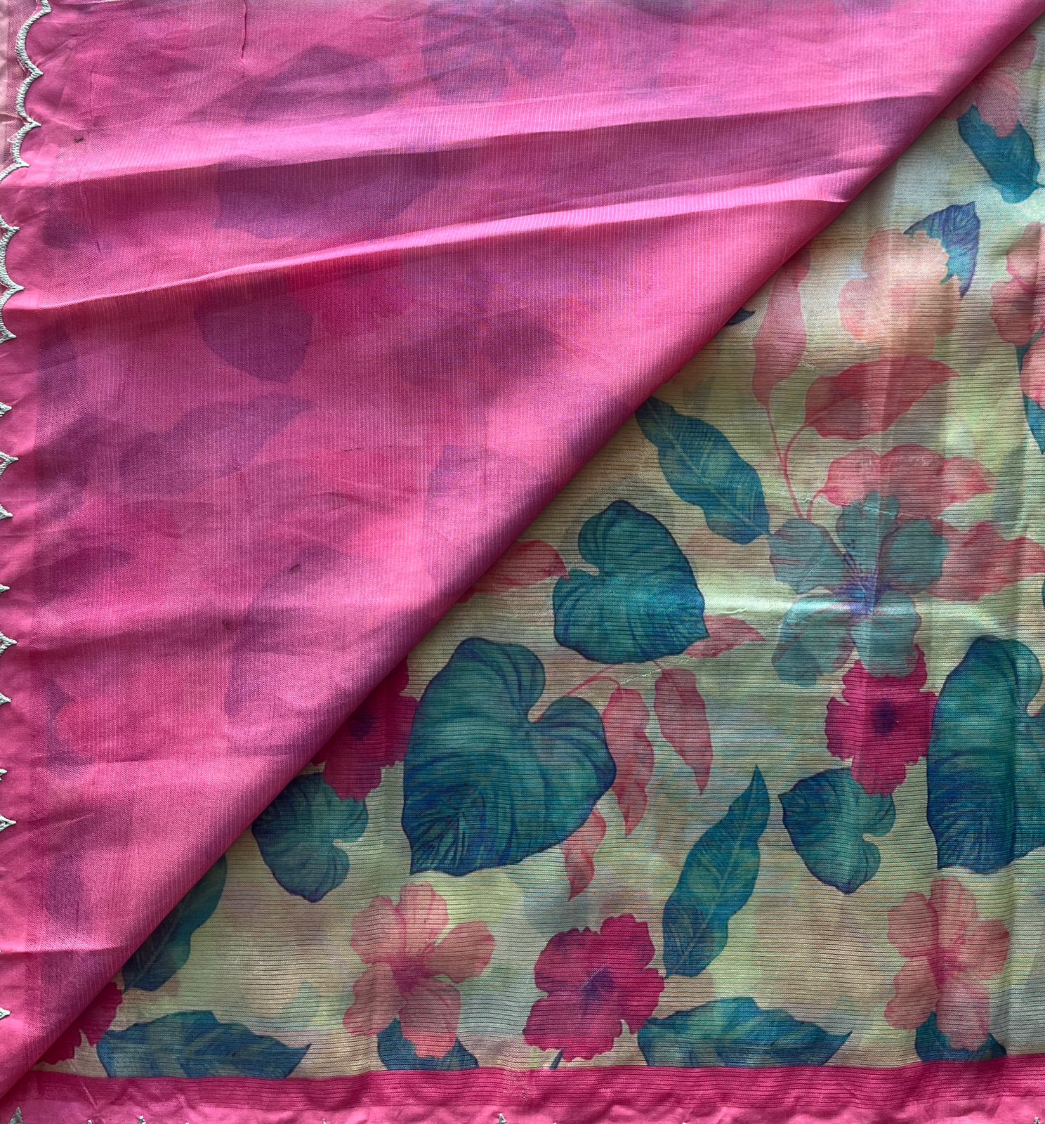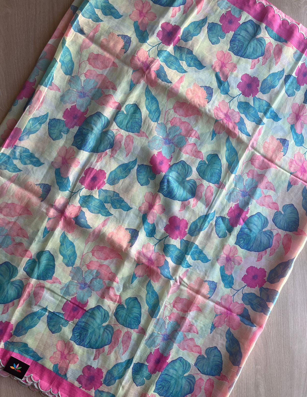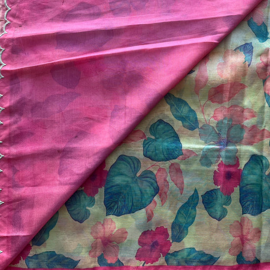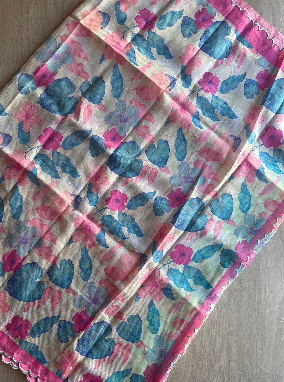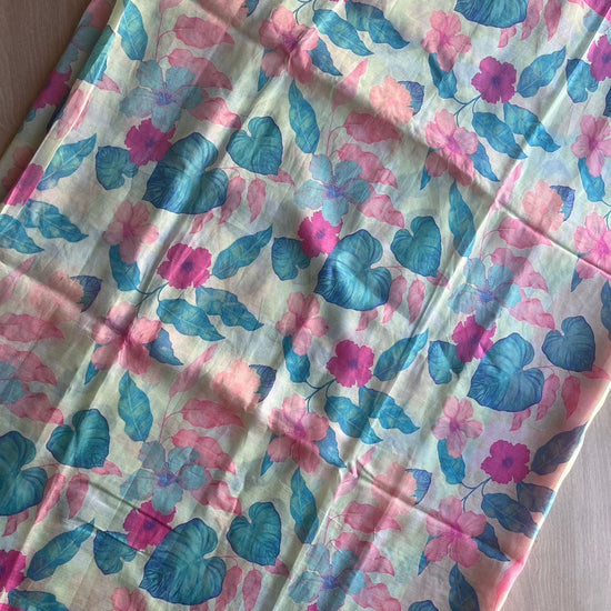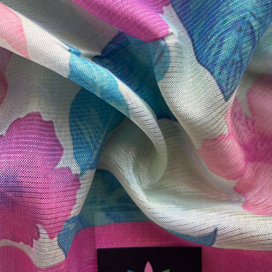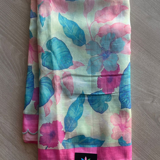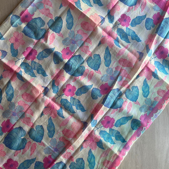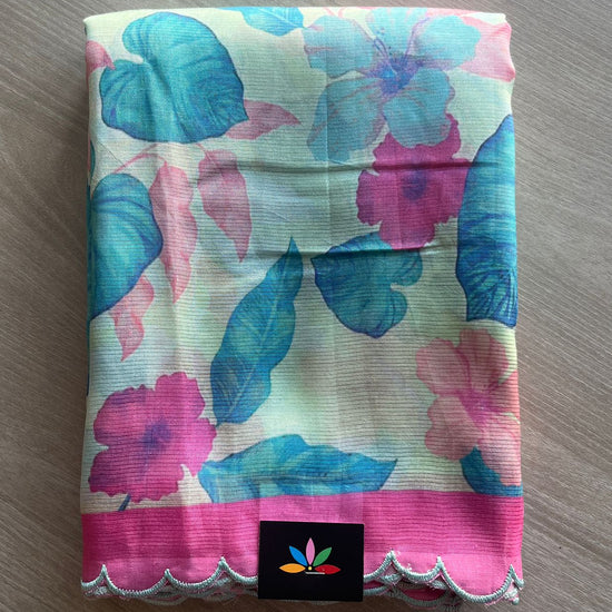 Soft Pastel Blue-Green & Pink Scallop Border Digital Printed Mangalagiri Silk Cotton Saree