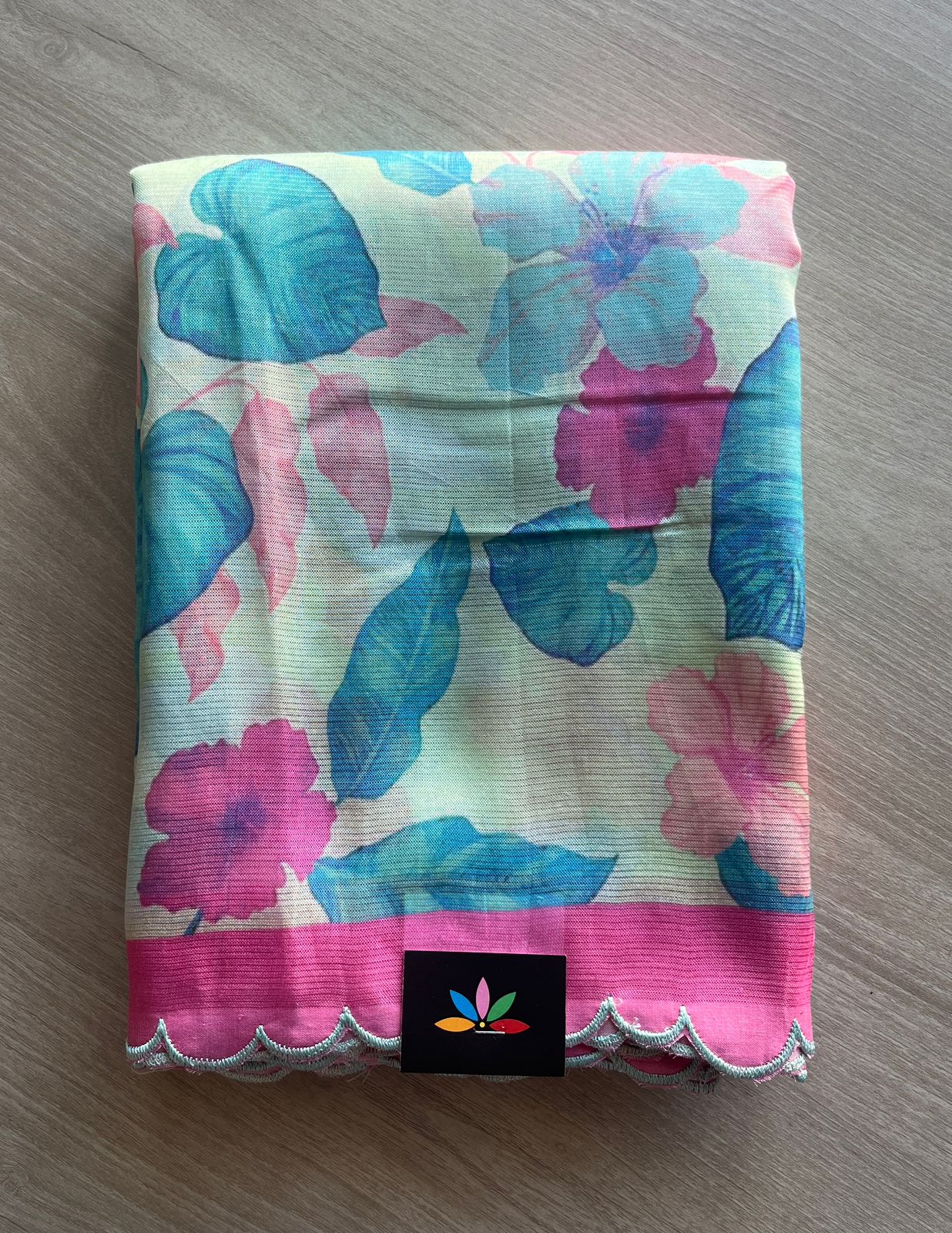 Soft Pastel Blue-Green & Pink Scallop Border Digital Printed Mangalagiri Silk Cotton Saree-29315